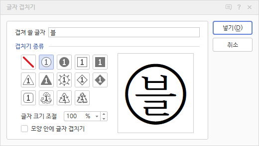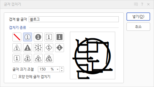 '글자 겹치기' 팝업을 보시면 아시겠지만, '원 문자' 말고도 네모, 세모, 마름모 등 다양하게 문자를 도형 안에 넣을 수 있습니다.