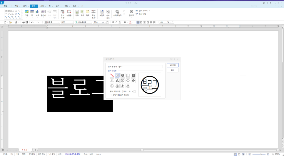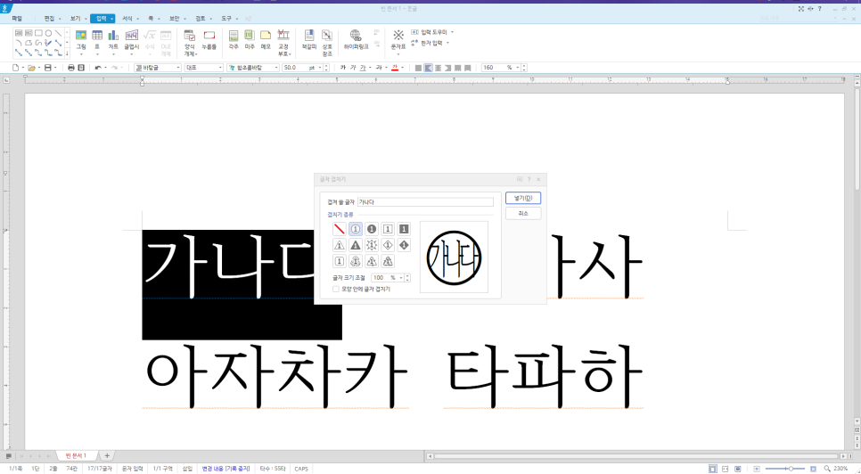 '글자 겹치기'까지 누르면 다음과 같은 팝업창이 뜹니다.