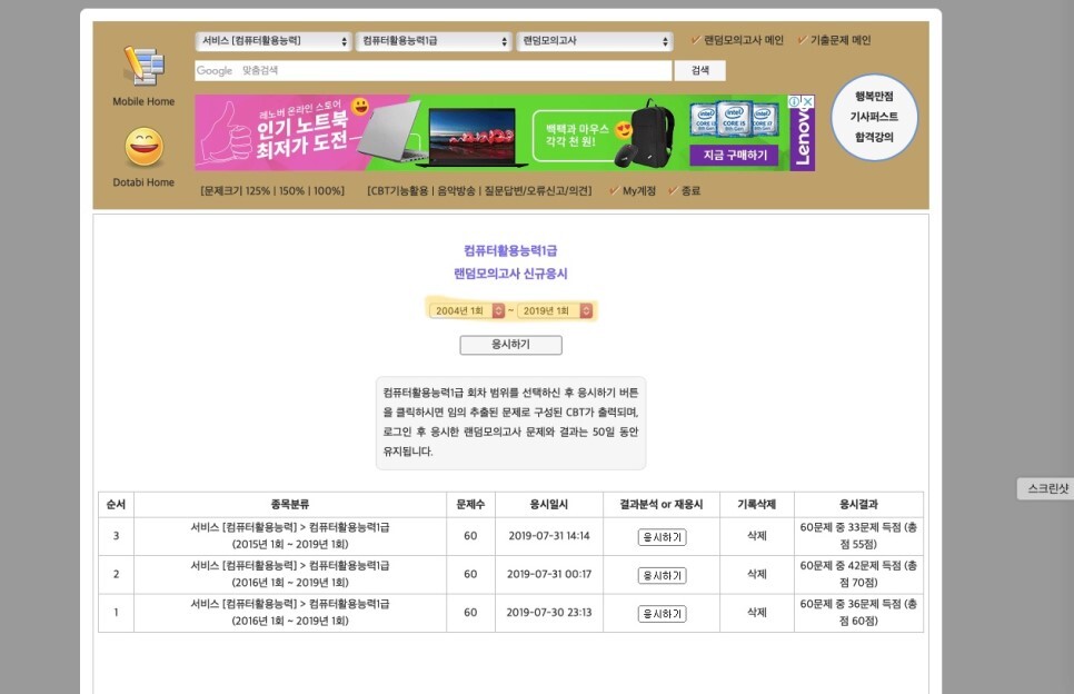 위 링크를 타고 들어가시면 아래와 같은 그림의 페이지가 나옵니다. 그중에서 '컴퓨터활용능력 1급'을 클릭하시면 두 번째 사진의 페이지가 나옵니다. 그 중에서 '기출문제 랜덤모의고사' 부분을 클릭해서 들어가시면 마지막 사진과 같은 페이지가 나옵니다. 랜덤 모의고사는 연도별 회차의 범위를 선택하여 응시하실 수 있으며 응시하신 모의고사의 결과가 누적되어 나타납니다.