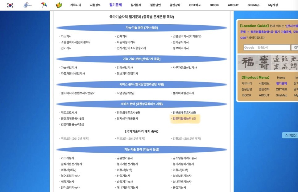 위 링크를 타고 들어가면 컴퓨터 베이스로 문제를 풀 수 있습니다. 연도별, 회차별 문제들과 해설이 포함된 답지가 있으니 공부를 하기에 부족함이 없었습니다. 그리고 더 모르겠는 부분에 대해서는 개념서를 참고했습니다. 2과목, 3과목도 마찬가지로 차례차례 공부를 해보시면 각 과목이 조금은 익숙해지실 겁니다. 처음에는 아무래도 용어들과 문제 형식에 익숙해지는게 중요하니깐요.