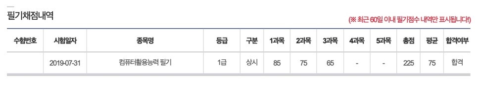 오래 걸렸던 합격의 결과를 보여드리면서 글을 마무리하도록 하겠습니다:) 조금이나마 컴활 1급을 준비하시는 분들께 도움이 되었으면 하는 바람입니다. 시험을 준비하시는 모두들 한 번에 합격하시기를 응원하겠습니다!