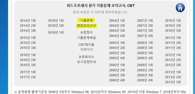 워드프로세서는 2012년부터 단일등급으로 시행되고 있고 컴활과 다르게 달라진 부분이 거의 없어서 기출의 양이 상당히 많습니다. 그래서 저는 윈도우 운영체제가 달라진 것을 기준으로 회차를 선택했습니다. 윈도우 XP는 지금과 너무 멀리 떨어진 영역이기도 해서 윈도우 7이 적용된 2014년부터 가장 최근인 2019년도 기출까지를 선택해서 모의고사를 응시했습니다. 지금은 기록이 모두 없어졌지만 5회정도 계속해서 응시한 것 같아요.