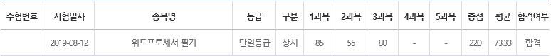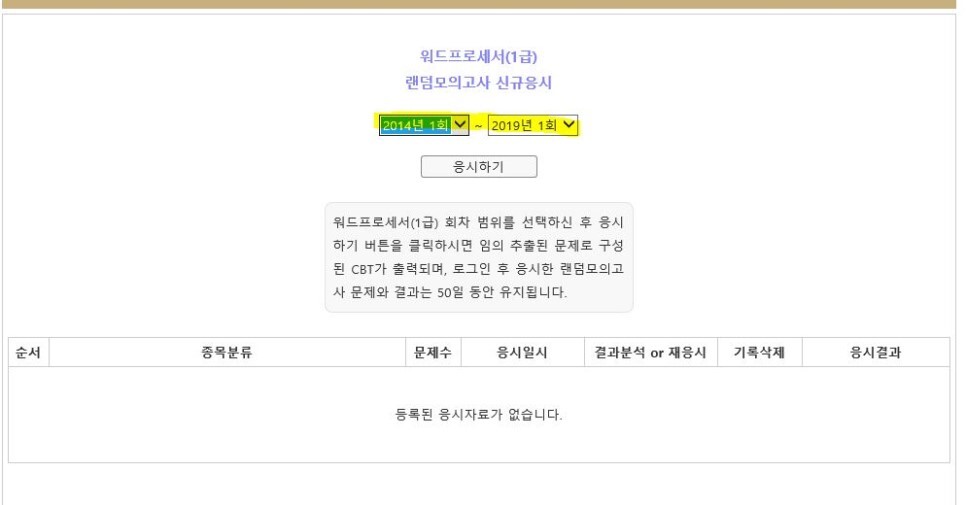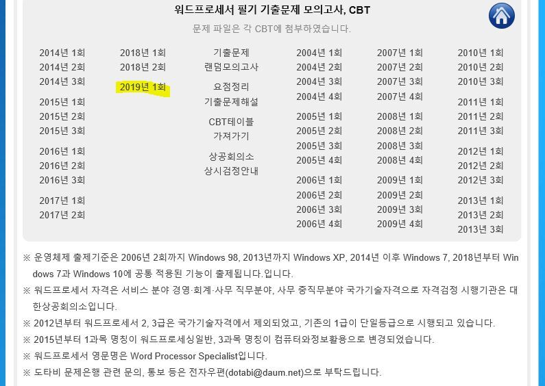 워드프로세서는 2012년부터 단일등급으로 시행되고 있고 컴활과 다르게 달라진 부분이 거의 없어서 기출의 양이 상당히 많습니다. 그래서 저는 윈도우 운영체제가 달라진 것을 기준으로 회차를 선택했습니다. 윈도우 XP는 지금과 너무 멀리 떨어진 영역이기도 해서 윈도우 7이 적용된 2014년부터 가장 최근인 2019년도 기출까지를 선택해서 모의고사를 응시했습니다. 지금은 기록이 모두 없어졌지만 5회정도 계속해서 응시한 것 같아요.