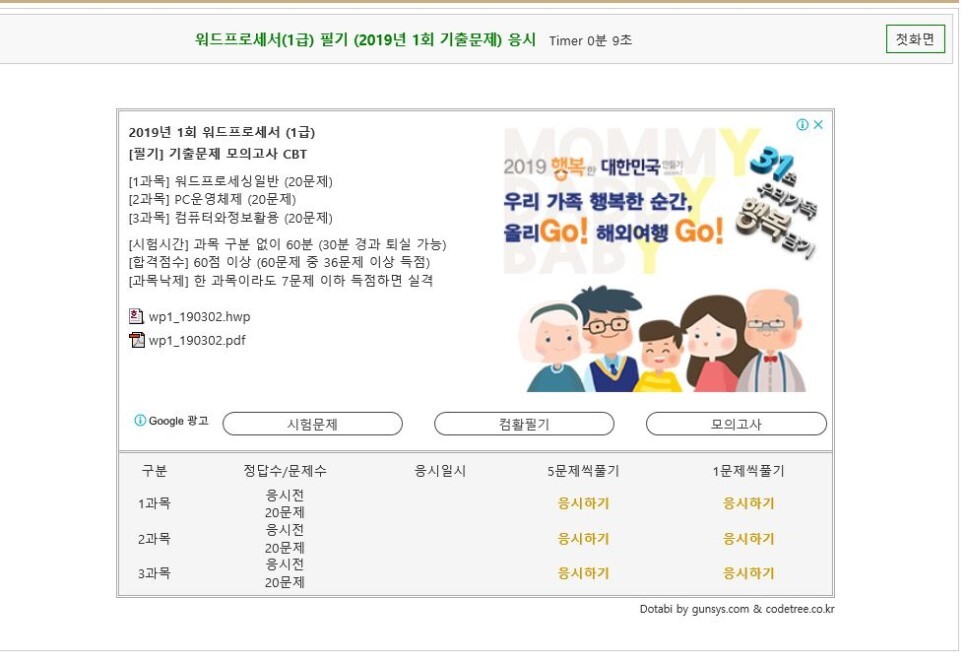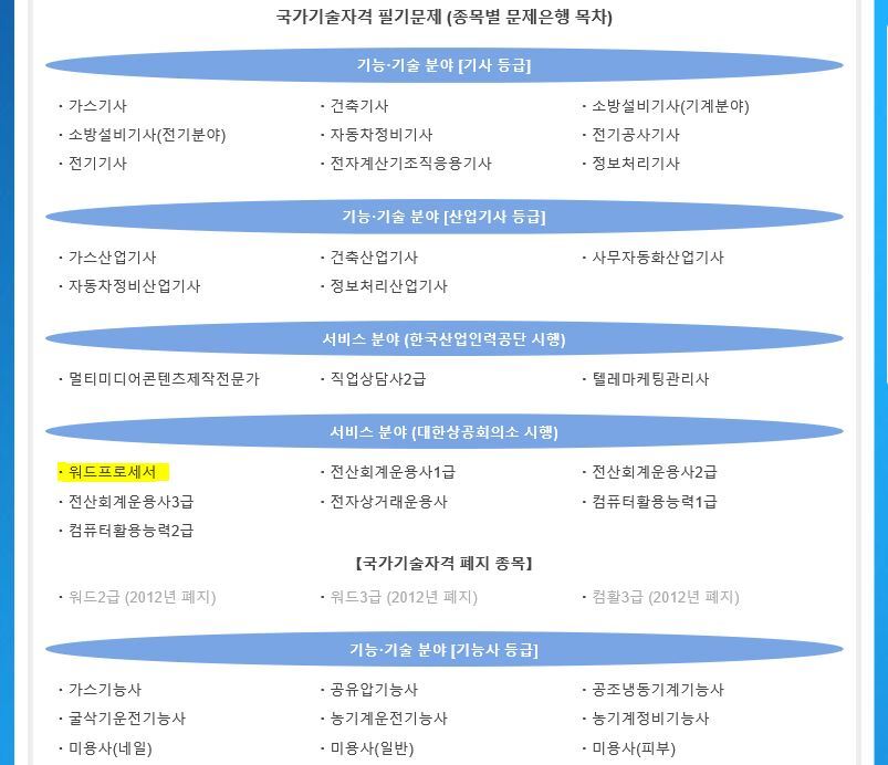 위 링크를 클릭해서 들어가시면 아래와 같은 화면이 나옵니다. 그 중에서 '워드프로세서'를 클릭해서 들어가시면 워드프로세서 필기 기출문제 모의고사가 전부 보여집니다. 그리고 '2019년 1회'를 클릭하시면 마지막 사진에서 보시는 것처럼 컴퓨터 내에서 풀어보실 수도 있고, 따로 파일을 다운받아 프린트해서 공부를 해보실 수도 있습니다.