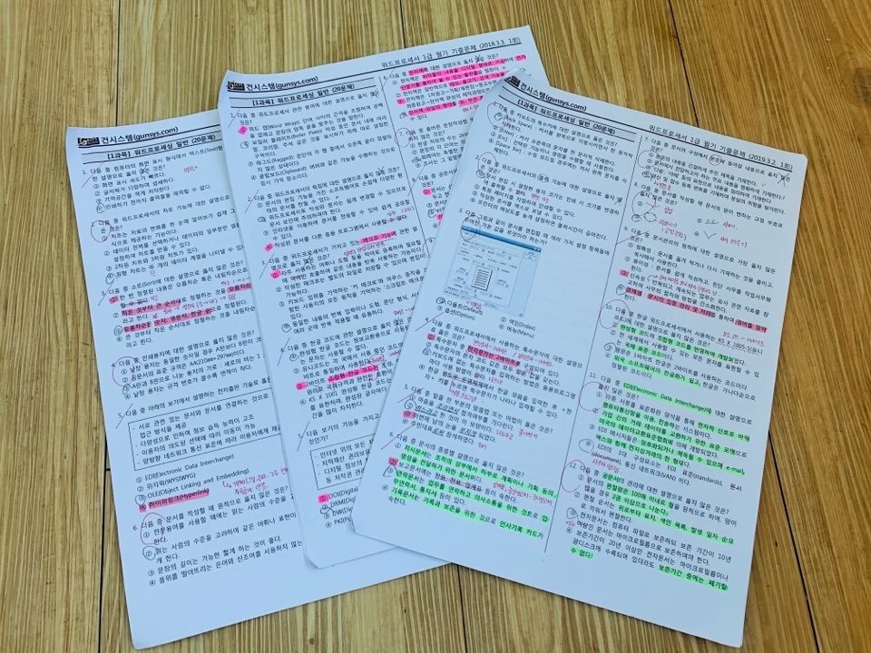 ★을 보시면 '기출문제 3회는 각 과목씩 모아서 공부하기' 라는 말이 있습니다. 말하자면 3회 정도는 각 1과목, 2과목, 3과목을 따로 모아서 풀기를 추천드립니다. 저는 최근 3회의 기출문제를 프린트해서 아무 공부하지 않은 채로 먼저 풀어보았습니다. 제가 쉽다고 말씀은 드렸지만, 컴활 필기 시험을 보고 흩어진 기억들을 가진 채 워드프로세서에 대한 어떠한 지식도 없이 시험을 보니 처참했습니다😝. 그래도 좌절하지 않고 맞은 문제, 틀린 문제 나누지 않고 확인하며 개념들을 익혔습니다.