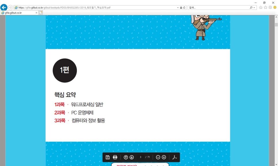위 화면에서 '자료실'을 들어가신 후에 '자격증으로 찾기' 중 '워드프로세서'를 선택하시고 '워드프로세스 필기'만 선택되도록 두면 워드프로세서 필기에 필요한 다양한 자료들이 제공됩니다. 그중, '학습자료'에서 '2019 시나공 기출문제집 워드프로세서 필기'를 선택하시면 핵심요약 자료가 제공됩니다. SUMMARY 시리즈에서 제공하는 핵심요약 자료들과 같은 내용의 자료인 것 같더라구요. 컴활 자료도 있어서 확인해보니 문제만 없을 뿐 개념 내용은 같았습니다. 그래서 말씀드리는 것은, 굳이 개념서를 사지 않으셔도 괜찮을 것 같다 하는 것입니다. 여기서 제공하는 핵심요약 자료를 통해서 모르는 문제들에 대한 개념을 확인하고 넘어가도 충분하다는 생각이 들었습니다. 자료는 PDF로 제공이 되니 취향에 맞게 확인해보시면 좋을 것 같습니다. 프린트를 해도 좋고, 디지털 자료로 확인해도 좋을 것 같습니다.😁