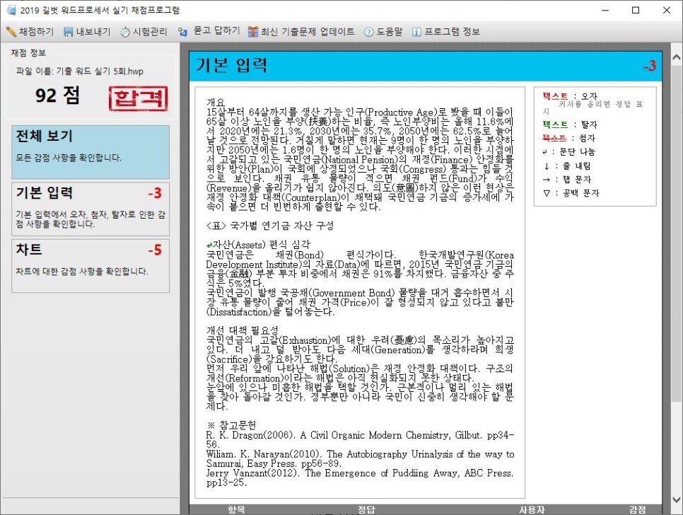 이 채점 프로그램을 통해서 책에 수록되어 있는 모의고사과 기출문제들을 풀면서 실기 연습을 충분히 할 수 있었습니다. 채점프로그램의 사용방식은 책에도 자세히 서술되어 있지만 어렵지 않습니다. 채점프로그램을 다운받아서 실행시킨 이후 채점을 받기 위해 저장한 한글 파일 자료를 잡아다 넣어주면 자동으로 채점을 해주는 방식이기 때문입니다. 개인적으로 굉장히 득을 봤던 프로그램이라 자신있게 추천을 해 봅니다. 해당 프로그램을 잘만 활용한다면 실기 시험 대비는 꽤나 완벽하게 가능하지 않을까 개인적으로 생각이 듭니다.