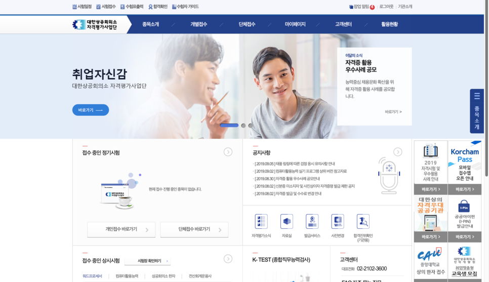 먼저, 위의 링크를 타고 '대한상공회의소' 홈페이지에 들어가면 아래 사진과 같은 메인 화면이 나옵니다. 여기까지는 공통된 작업입니다.