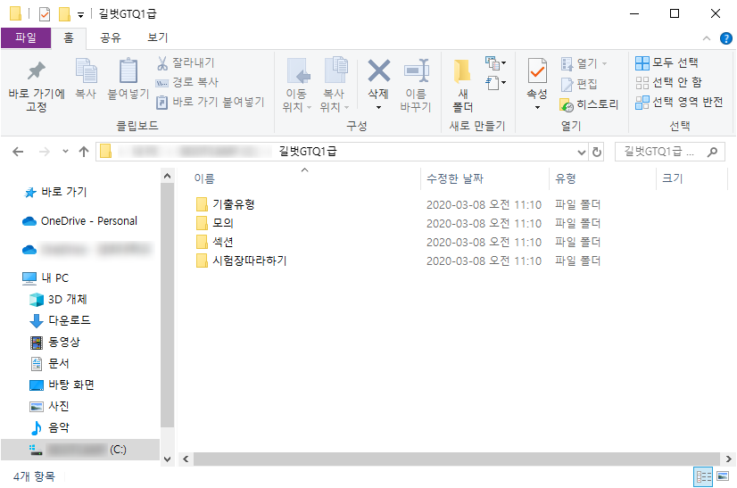 그렇게 해서 책을 선택하시면 실습예제 부분에 선택된 책이 나옵니다. 선택된 책을 또 선택을 하게 되면 다운 받을 수 있게 되어 있습니다. CD에 있는 자료들을 이렇게 받을 수 있습니다. 그걸 다운을 받으시면 '길벗 GTQ 1급'이라는 폴더 속에 자료들이 제공됩니다. '기출유형', '모의', '섹션', '시험장따라하기'의 폴더로 나눠진 자료들은 책에서 설명하는 것들을 따라 할 수 있도록 자료들을 제공해줍니다.