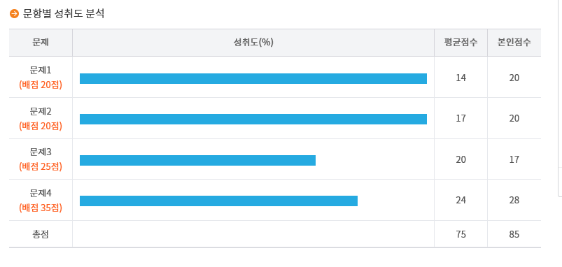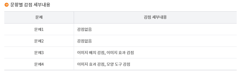 마지막으로 성적표입니다. 시험을 본 후 약 4주 뒤에 'KPC자격 홈페이지'를 통해서 성적을 확인해볼 수 있었습니다. 아래와 같이 문제 별 감점 현황과 성취도 분석 점수를 통해서 어떤 문제에서 무엇이 어떻게 감점이 되었는지 보다 자세하게 확인해 볼 수 있습니다. 다만, 문항별 세부내용은 계속해서 확인해볼 수 있는 것이 아니라 성적 발표 후 일주일(?) 동안에만 확인이 가능한 것으로 알고 있습니다. 그 후에는 그저 합격/불합격 여부만 확인이 가능하구요. 그래서 본인의 자세한 성적 내역을 지속적으로 열람 가능한 상태로 두고 싶으신 분들은 저처럼 해당 내역을 캡쳐해서 가지고 계시는게 좋을 것 같습니다:)