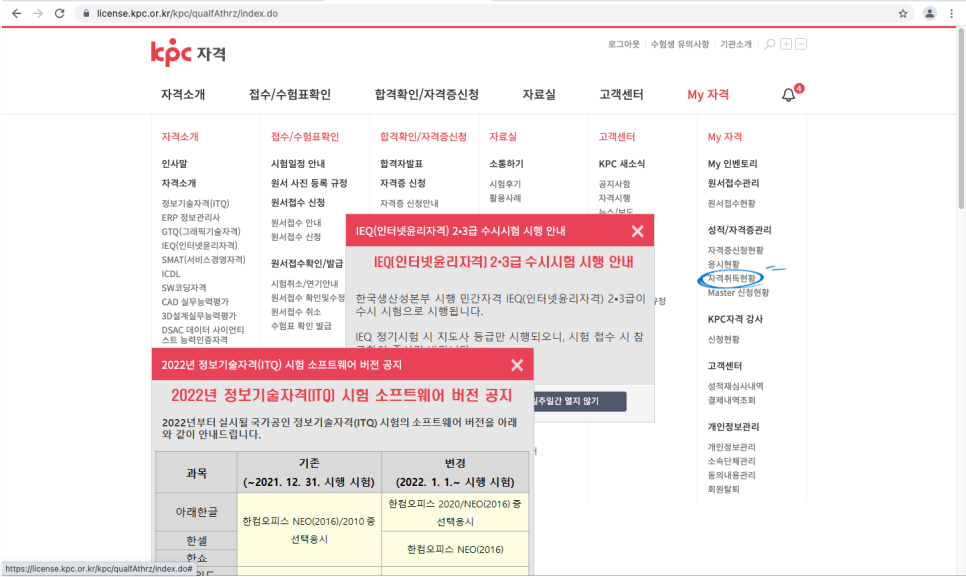 아래와 같은 화면이 나오는데, [My 자격]에 마우스 커서를 두고 들어가 봅니다.