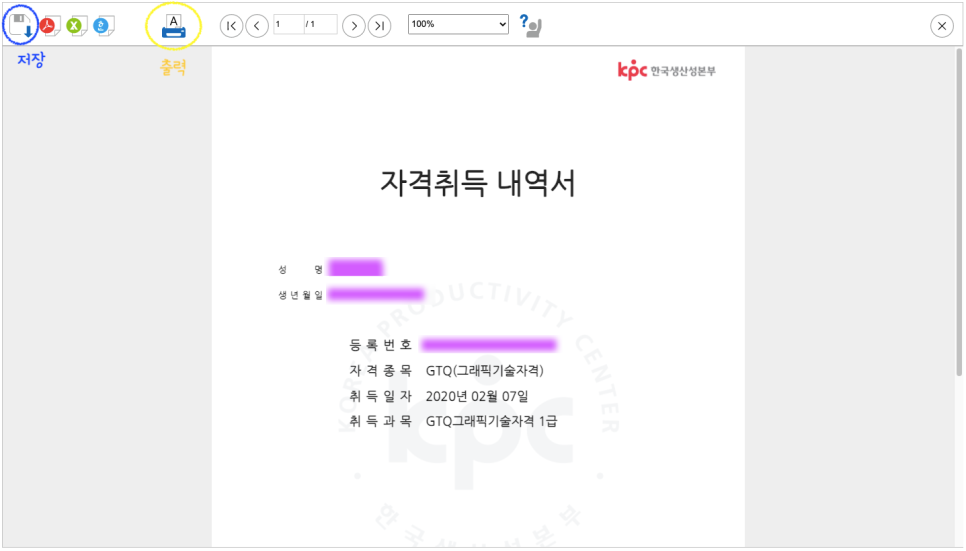 [대한상공회의소]와는 다르게 [한국생산성본부]의 [취득내역서]는 프린터가 없어도 저장이 가능합니다. 출력도 가능하고 pdf 파일, 엑셀 파일, 한글 파일로 저장도 가능합니다:) 원하는 형태로 출력/저장 하면 될 것 같습니다.