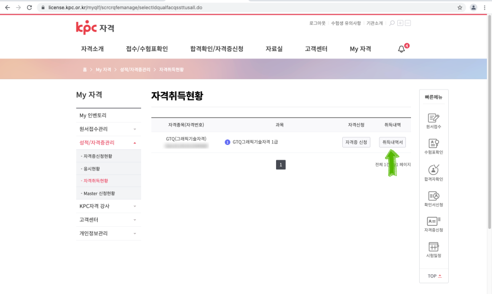 [자격취득현황]에 들어오면 [한국생산성본부]에서 취득한 자격증 목록이 나타납니다. 저는 [GTQ그래픽기술자격1급] 하나만 취득했기 때문에 한 가지가 나오네요:) 그러면 [취득내역서]를 선택해서 들어갑니다.
