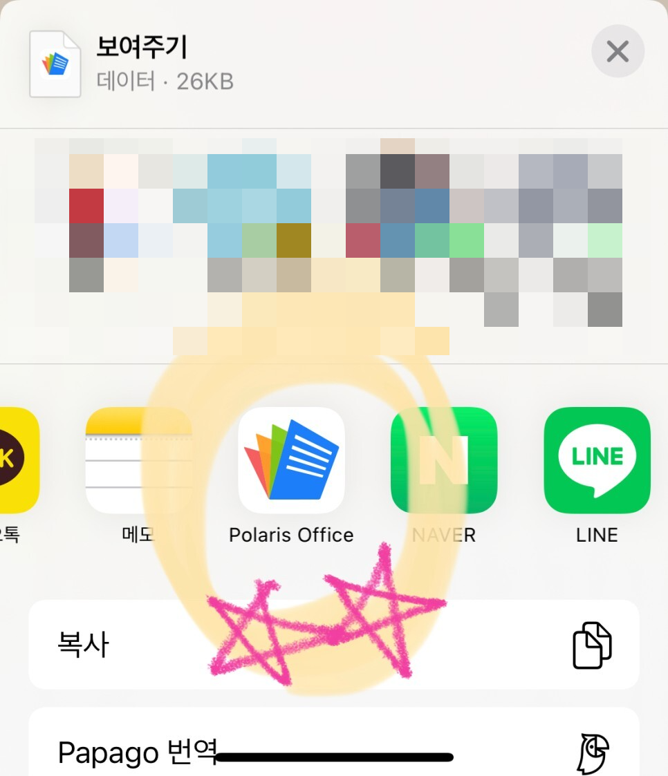 먼저 필요한 어플은 문서 열람이 가능한 어플입니다. 특정한 어플 이름을 말하지 않은 이유는, 문서가 열람만 된다면 어떤 어플이든 상관 없기 때문이에요. 저는 아이폰에는 'polaris office'라는 문서 열람 어플이 깔려 있고, 아이패드에는 '한컴오피스'라는 어플이 깔려 있었는데요. 그냥 깔린 어플 그대로 사용했습니다. '인쇄' 기능을 사용할 수만 있다면 어떤 어플이든 상관 없습니다!
