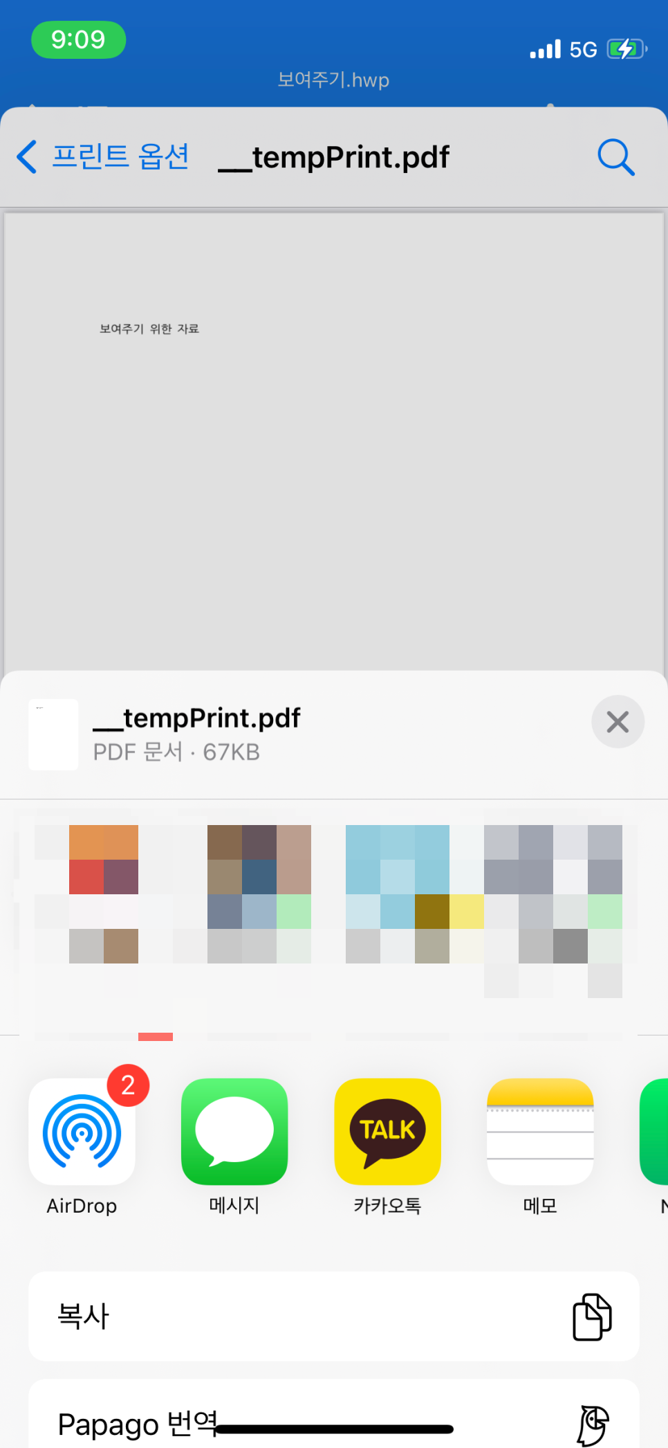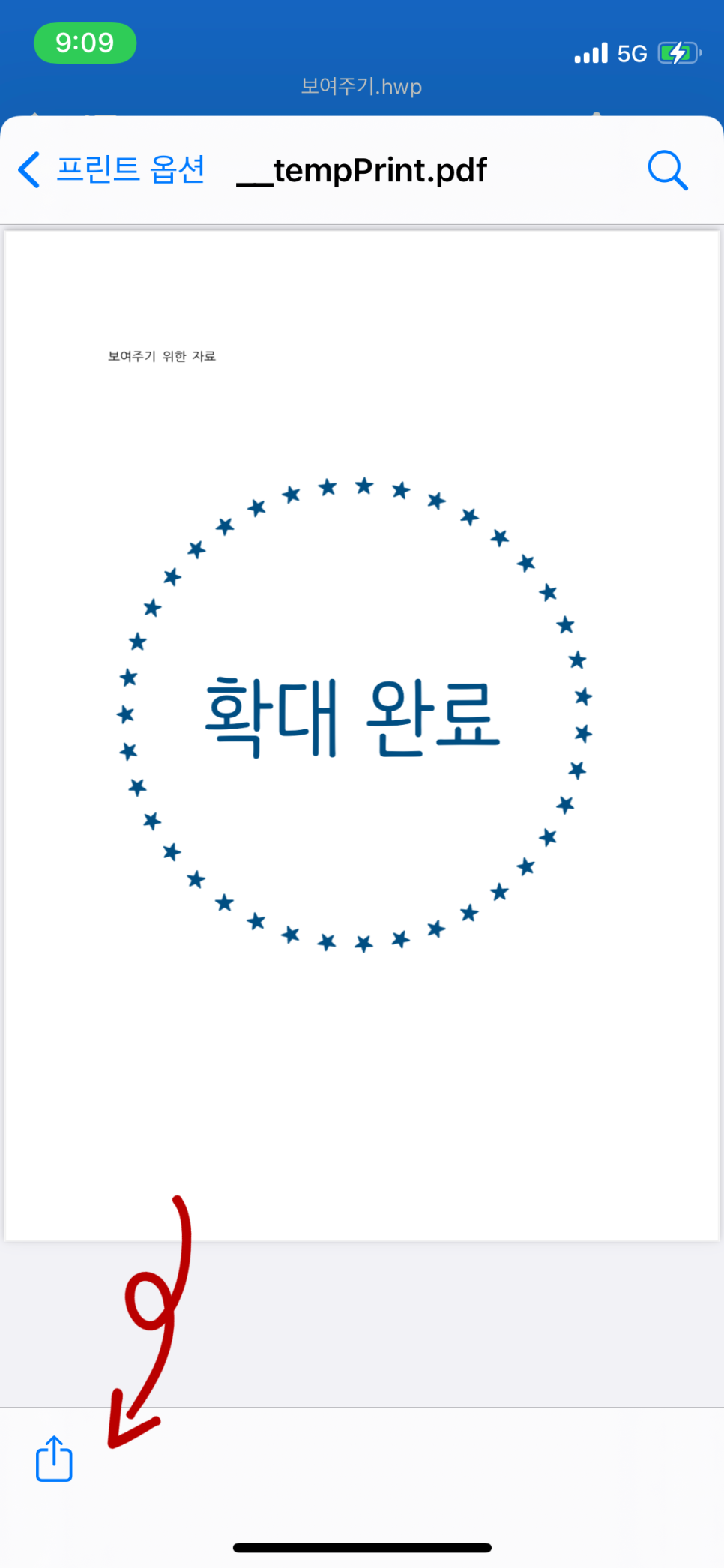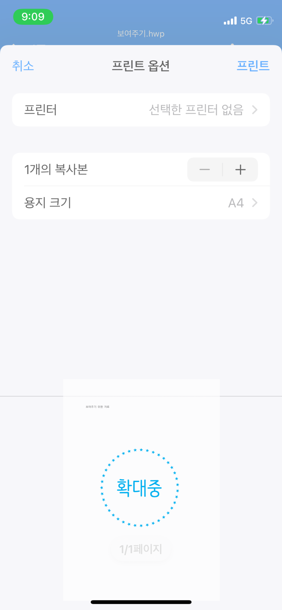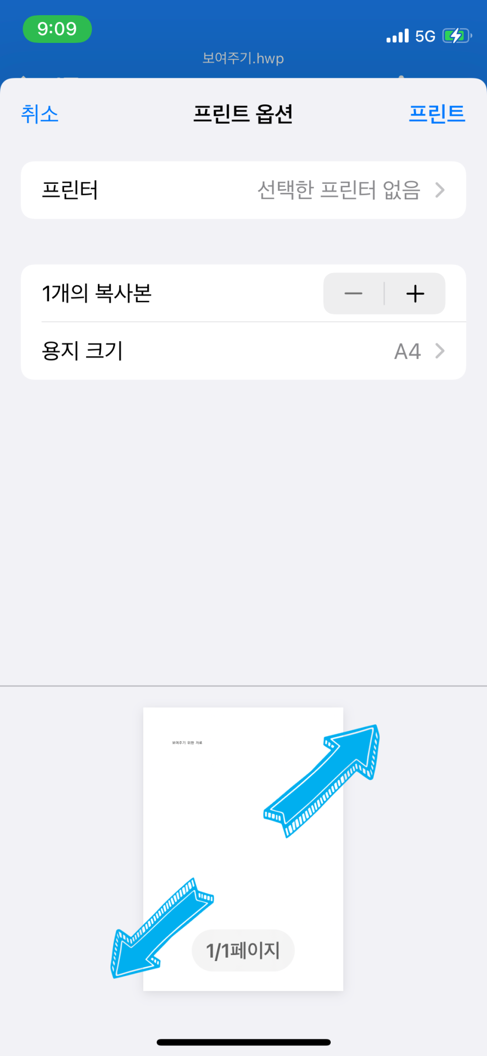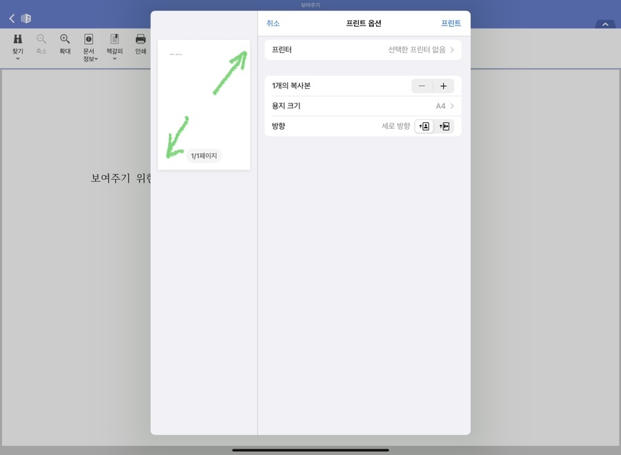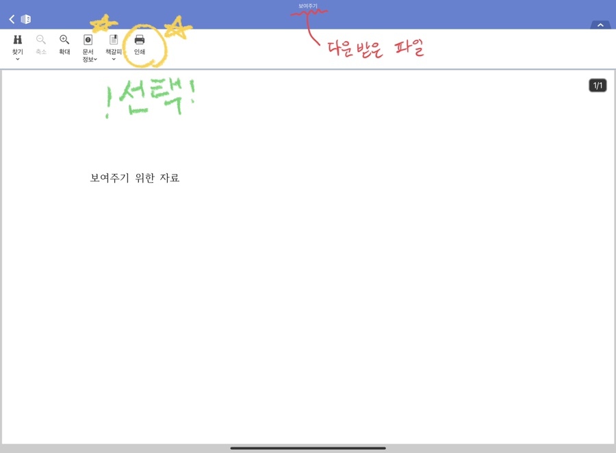 문서 제목을 통해서 다운을 받은 파일임을 알 수 있습니다. 인쇄를 선택해서 '프린트 옵션' 화면이 나오면, 똑같이 미리보기 화면 속 문서를 두 손가락을 이용해서 한껏 키워주시길 바랍니다. (ˊᵒ̴̶̷̤ ꇴ ᵒ̴̶̷̤ˋ)و
