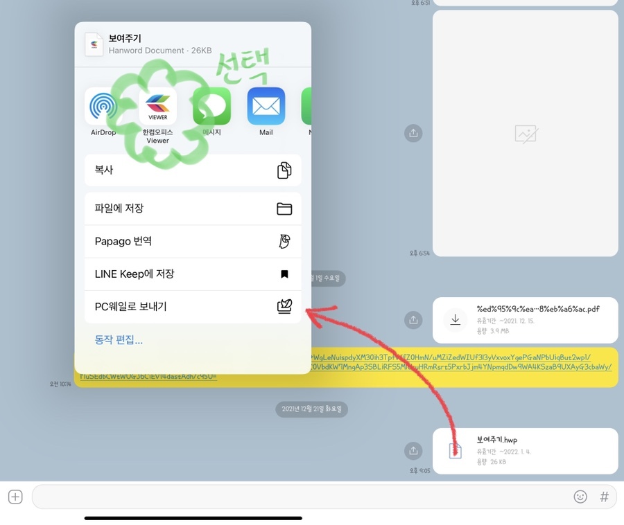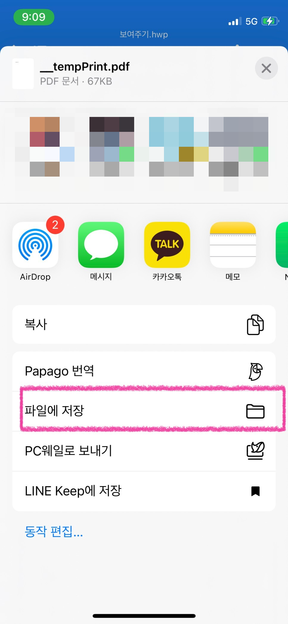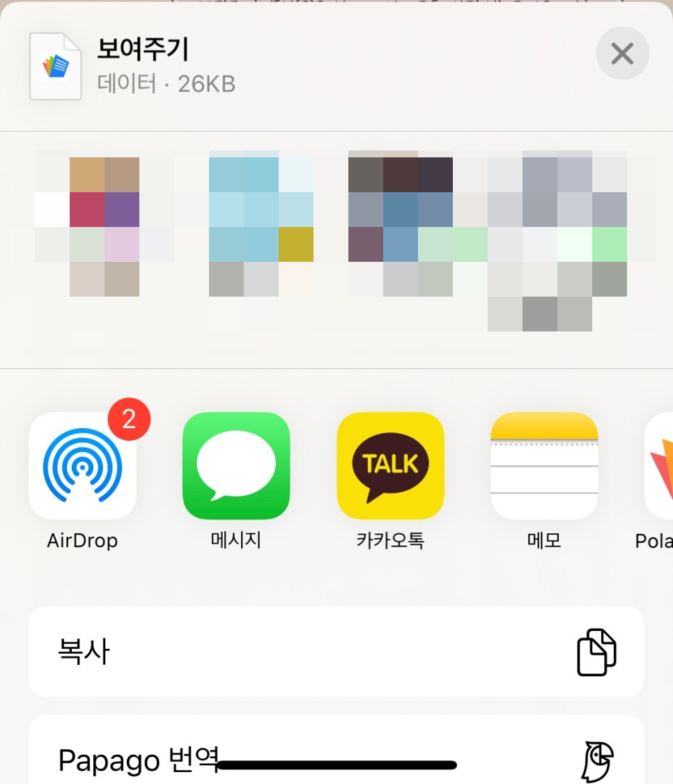 해당 문서를 공유하기 위해서는 그냥 바로 다른 누군가에게 공유를 하는 방법도 있지만, 저는 해당 파일을 별도로 작업을 진행중인 기기에 문서로 저장하는 방법을 알려드리고자 합니다. 공유 버튼을 누르면 나오는 여러 선택지 중에서 '파일에 저장' 을 눌러주세요.