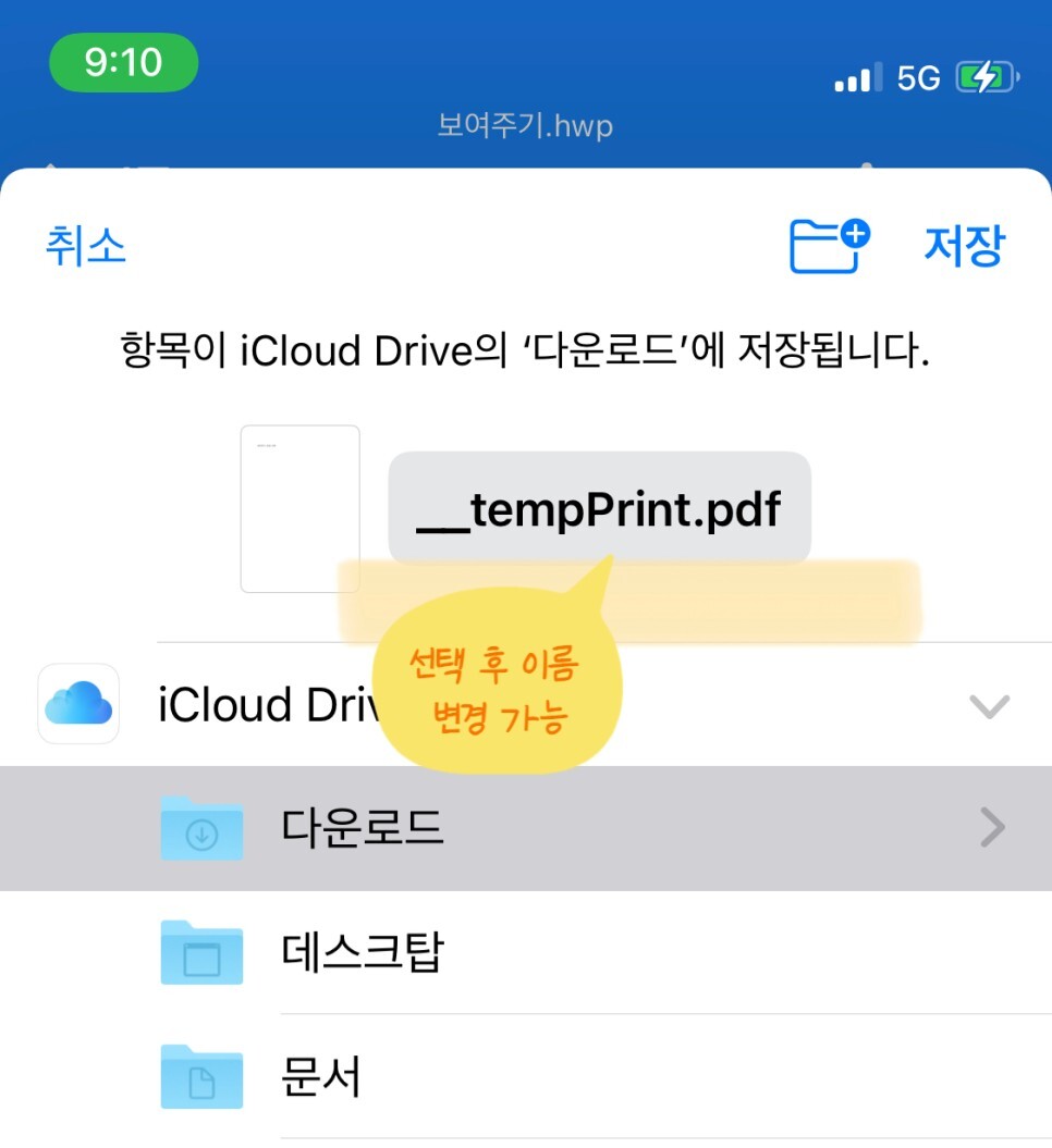 그러면 아래와 같이 이름도 변경할 수 있고, 저장 장소도 선택 가능해집니다. 저는 'iCloud Drice' 내에 있는 '다운로드' 폴더에 저장했습니다. 이름도 '보여주기'로 변경했어요.