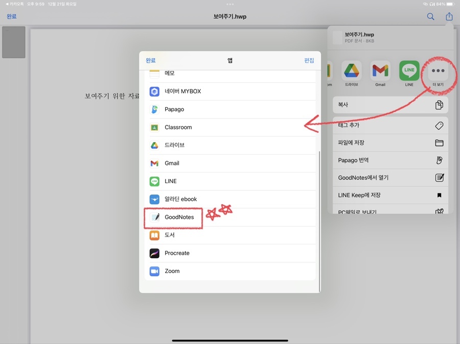 이번에는 해당 문서를 바로 [굿노트] 어플에 적용해보려고 합니다. 아이패드니까요! '공유' 버튼을 클릭한 후 나오는 어플 중에 [굿노트] 어플이 바로 보이지 않을 경우, '더 보기'를 눌러서 [굿노트] 어플을 찾아주시면 됩니다.