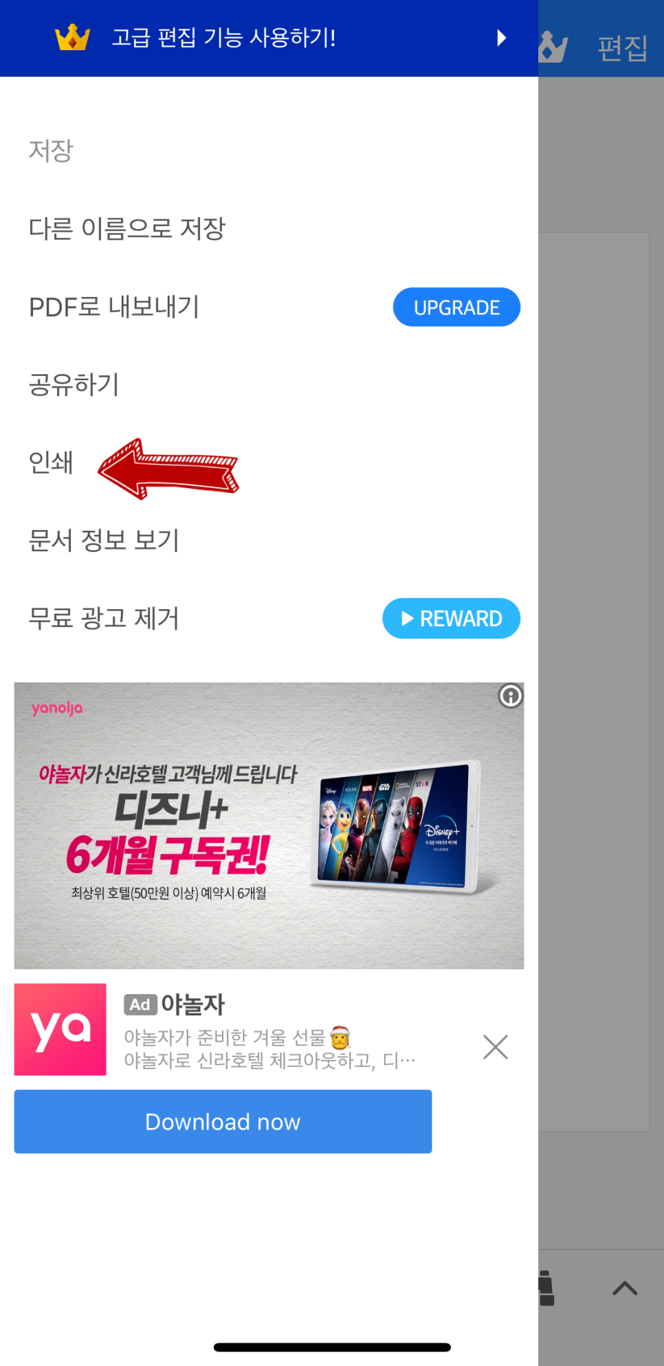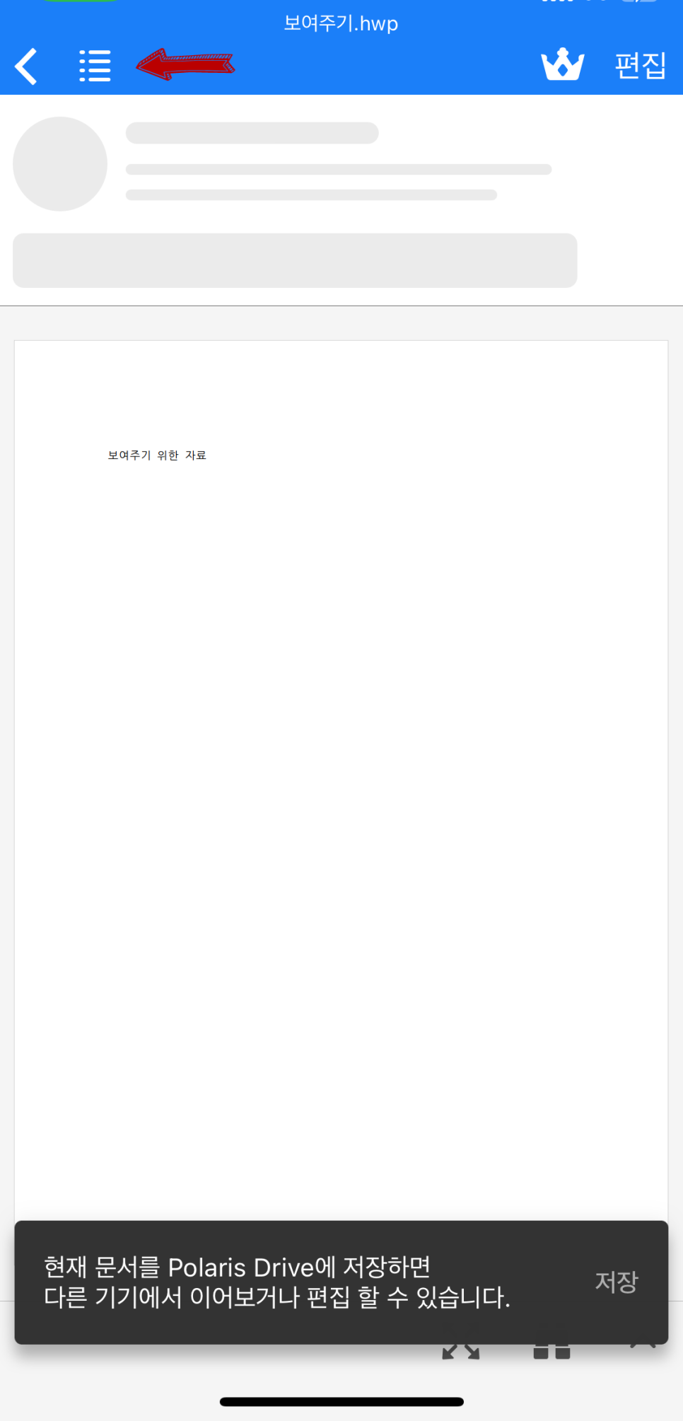 아래와 같이 '보여주기.hwp'라는 제목으로 문서가 열리게 됩니다. 그리고 그 내용으로 '보여주기를 위한 자료'라고 제가 작성해 둔 문서 자료도 보이게 됩니다. 그러면 이제 해당 한글 문서 파일을 pdf 파일로 만들기 위해서는 '인쇄' 옵션을 찾아야 합니다. 'polaris office' 어플의 경우 왼쪽 상단의 [·-] 4개로 이루어진 그림을 선택하면 오른쪽 사진과 같이 옵션들이 나오게 됩니다. 그 중에서 '인쇄'를 눌러주세요. (PDF로 내보내기 UPGRADE 할 필요 없어요!)