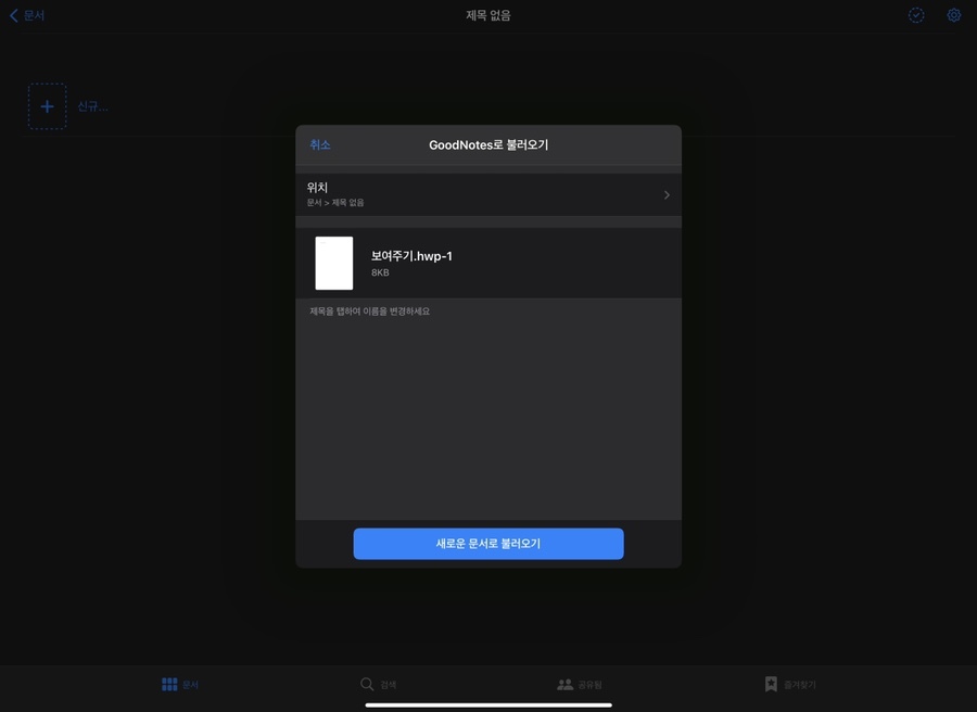 [GoodNotes(굿노트)] 어플을 누르면 아래와 같이 나옵니다. 문서를 불러올 수 있게 된 것입니다. 새로운 문서로 불러오면 아래와 같이 나오게 되니, 어떤 문서가 되었든 이렇게 굿노트에서 필기도 하고 기타 등등 작업을 할 수 있겠죠!
