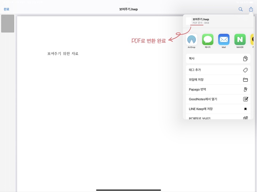 그러면 아래와 같이 공유할 수 있게 나오고, '공유' 버튼을 선택하면 기본적으로 해당 문서가 pdf 파일로 변환 되었음을 알 수 있습니다!
