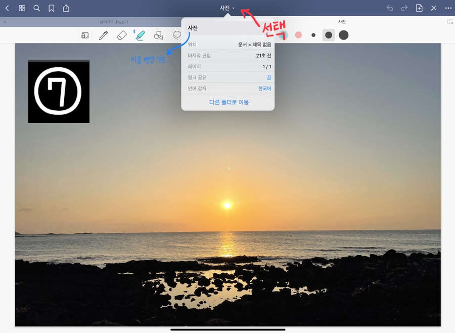 '사진'이라는 이름이 어색하고 싫을 땐, 파일명을 바꿔주면 됩니다. 상단에 보이는 '사진'을 선택하면 문서 정보가 보이게 되는데요. 거기서 '사진'이라는 이름을 바꿔주시면 됩니다. 저는 '제주시 구좌읍 노을'이라는 이름으로 바꿔주었어요. 그렇게 파일명을 바꿔주면 ⑨에서 보이듯이 문서의 이름이 바뀌어 있는 것을 보실 수 있습니다:)