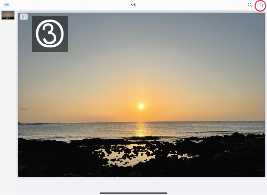저는 icloud drive 속 [다운로드] 폴더에 저장하고자 했습니다. 이때도 이름은 그냥 '사진'으로만 나와 있어서 이름을 바꿔주었어요. ①에 '사진'이라는 글자를 선택하면 ②와 같이 문서 이름을 변경하도록 나옵니다. 문서 이름을 '제주시 구좌읍 노을 사진'으로 변경 후 '완료'를 눌러주면 ③과 같이 이름이 변경되어 보여져요. 이름까지 모두 변경을 완료했으면, '저장'을 눌러 파일을 마저 저장해줍니다.