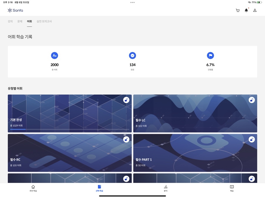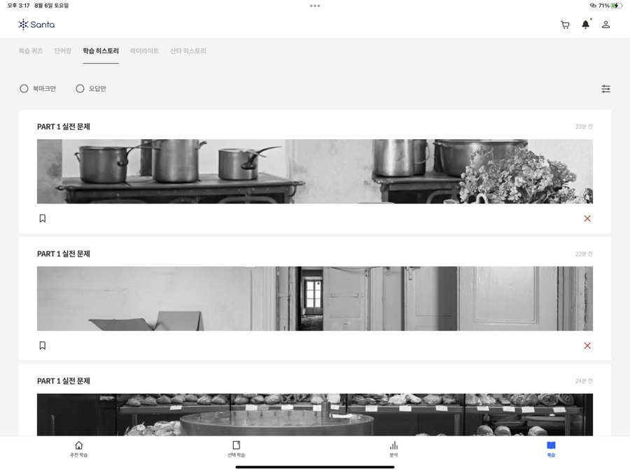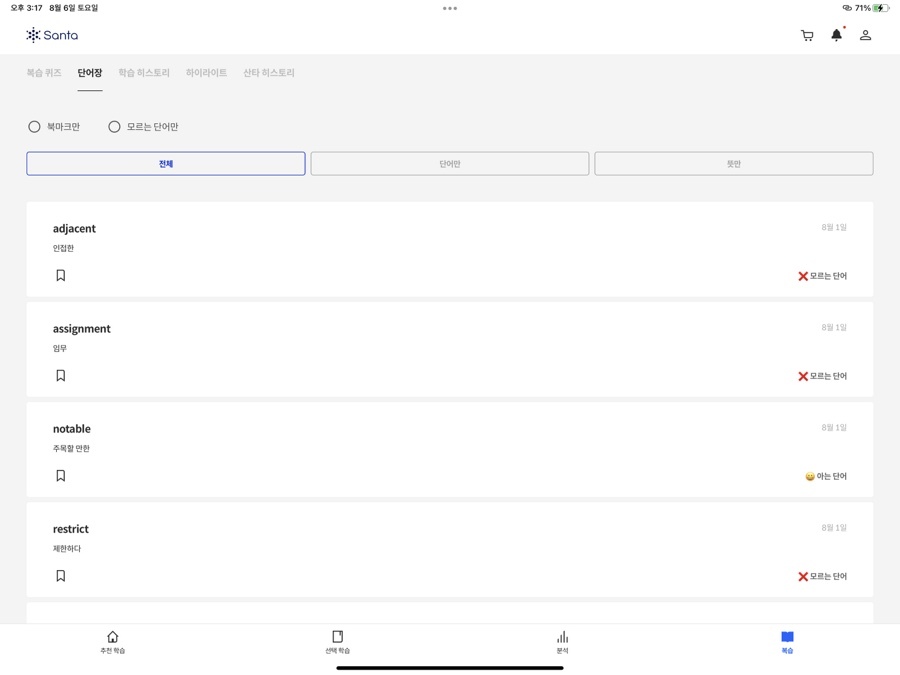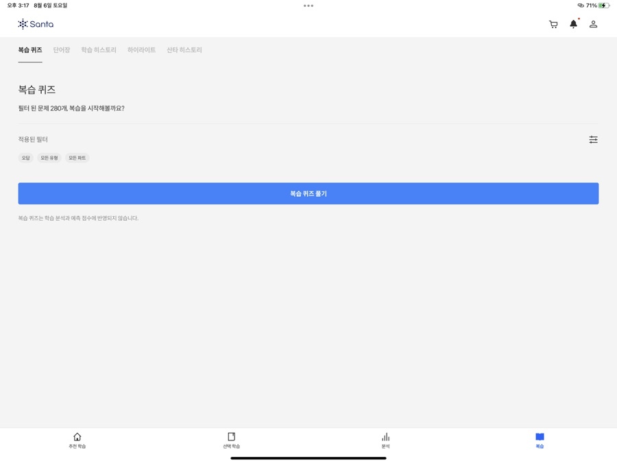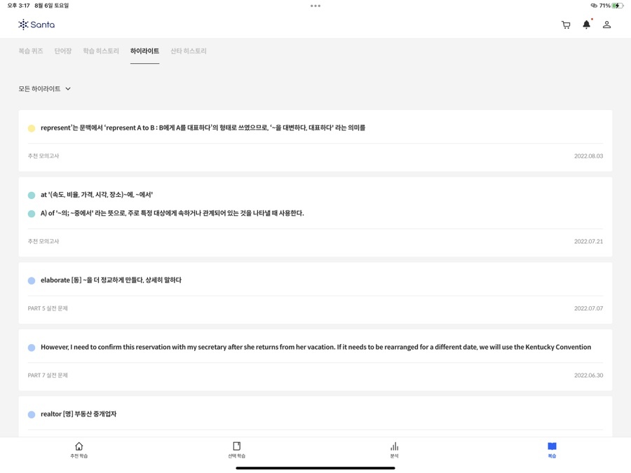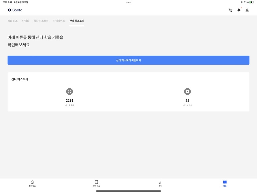 '복습 퀴즈'에서는 지금까지 풀이한 문제를 총 망라해서 랜덤으로 문제를 출제해주는 형식이 있고, '단어장'에는 어휘 시험과 [추천 학습] 중에 진행된 어휘 학습 중에 학습한 어휘들 중에서 아는 단어와 모르는 단어를 구별해서 보여주는 형식이 있습니다. '학습 히스토리'는 북마크를 한 문제 혹은 틀린 문제가 나옵니다. 복습할 수 있도록 말이죠. '하이라이트'에서는 학습 중에 형광색으로 칠할 수가 있게 되어 있는 부분이 있는데요. 그렇게 체크해 둔 부분이 모아서 등장하는 부분입니다. '산타 히스토리'는 말 그대로 지금까지 학습한 모든 학습 기록을 볼 수 있습니다. 맞은 것, 틀린 것, 시청한 강의 등 모든 것을요. 이렇게 [복습] 코너를 통해서 지금까지 학습한 내용을 다시 확인하며 부족한 부분을 채울 수 있게 됩니다.