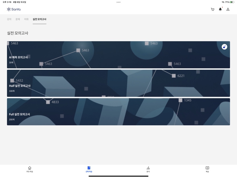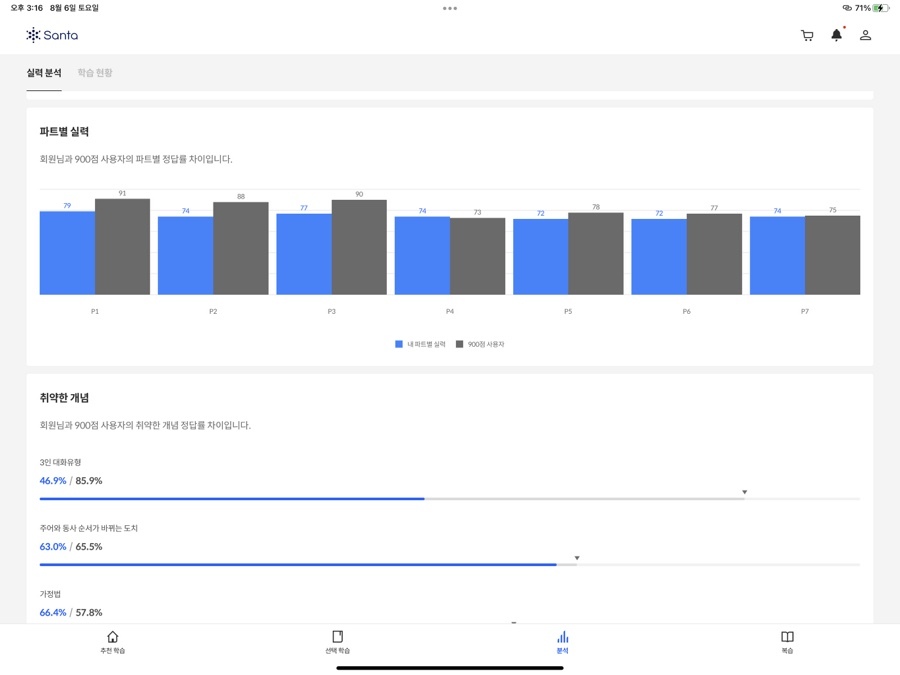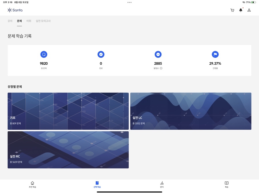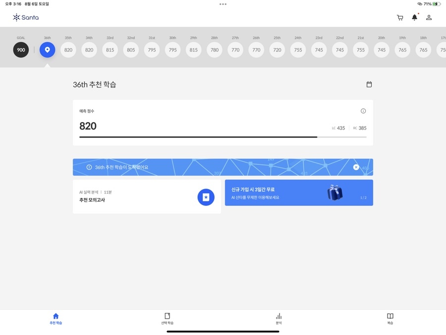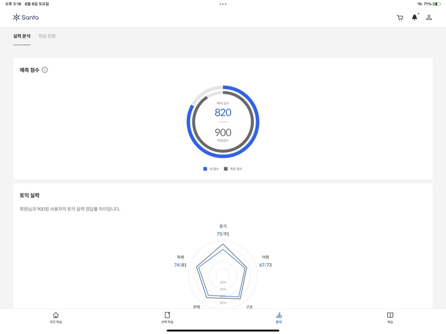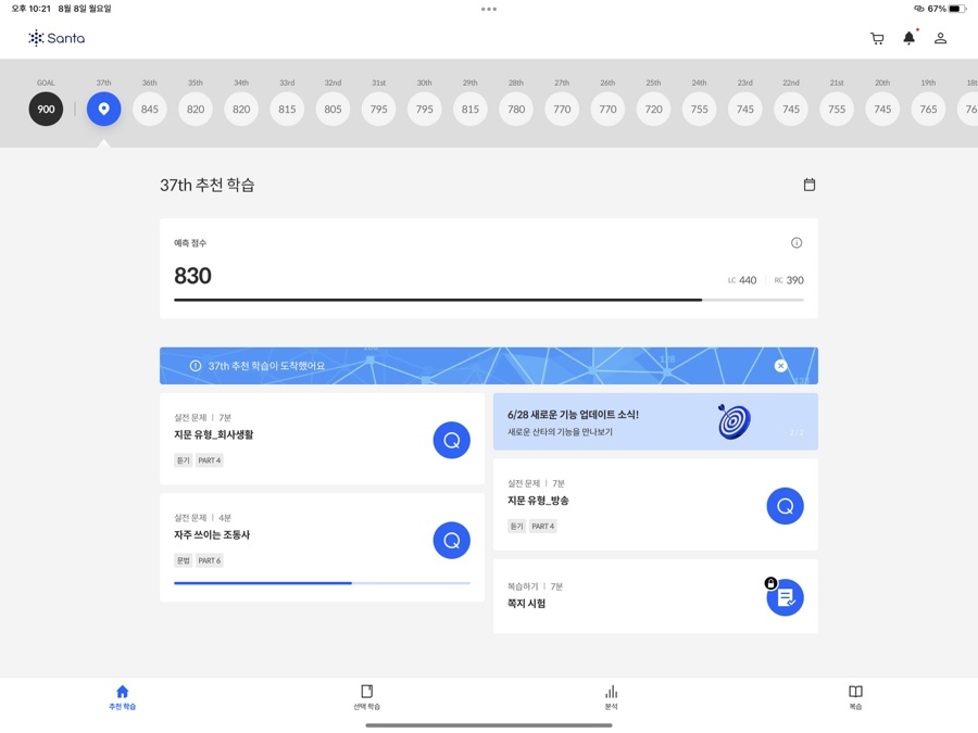 메인 화면에서는 [추천 학습]과 지금까지 학습 내용을 바탕으로 도출해 낸 '예상 점수'를 보여줍니다. 처음 학습을 시작하기에도 좋고, 지금까지 얼마나 공부했는지도 한눈에 보여서 성취감도 있어요. 학습 의욕이 생길만한, 깔끔하고 단정한 메인이라고 생각합니다.