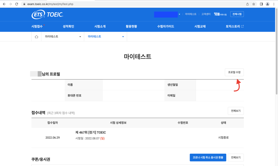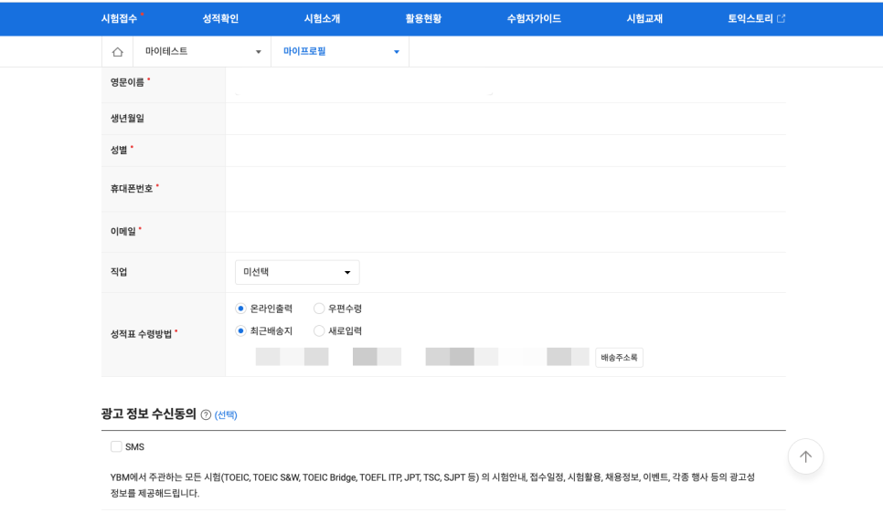 시험 결과는 시험 후 10일 뒤에 결과가 나옵니다. 각자 설정해 둔 성적표 수령 방법으로 받으실 수 있습니다. ↓ 아래 사이트(토익 시험 접수 공식 사이트입니다.)에 들어가서 로그인 한 후 '마이테스트' → '프로필 수정' → 하단의 '성적표 수령방법'에서 확인과 수정이 가능합니다.