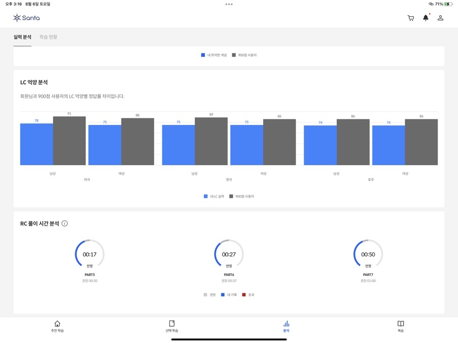 혼자서 학습을 시작하기 힘들다는 것에는 동의합니다. 하지만, 그럼에도 확실한 건 효과가 있다는 거예요. 다른 복습이나 어휘나 그런 것들을 하지 않고 [추천 학습]만 꾸준히 해도 조금씩은 토익 영어 실력이 는다는 것입니다. 기본적으로 지속적으로 학습을 하다 보면, 토익 시험에 등장하는 7가지의 문제 양식에 익숙해지고, 영어에 익숙해지니까 늘 수밖에 없어요. 어떤 공부 양식이든 꾸준히 공부하면 실력이 는다는 것은 마찬가지겠지만, 산타 토익은 그 날 그 날 추천해주는 학습 분량만 꾸준히 진행하면 되는 거라, 저는 정말 편하고 좋았습니다.