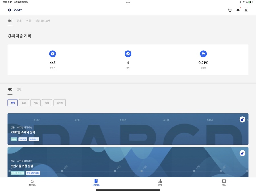 산타 토익은 어플로 혼자서 공부하도록 만들어진 시스템입니다. 강제를 하는 사람도 없고, 해야만 하는 숙제도 없으며, 학습을 하지 않았다고 뭐라고 하는 사람도 없습니다. 그래서 사람에 따라서는 더 힘들 수도 있어요. 저도 4개월짜리 강의를 구매하고서도 2달을 놀았으니, 할 말이 없죠. 저는 진짜 돈이 아까워서 했습니다. 토익 시험비가 아까웠고, 강의료가 아까워서 꾸역꾸역 하루에 한번 [추천 학습]이라도 해야겠다는 마음으로 학습을 진행했어요. 그렇게 무언가 '해야만 하는 이유'를 만들어서 학습을 진행하시기를 바라요.