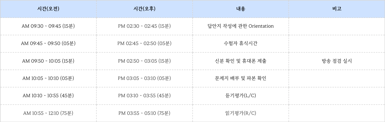 - 필수 준비물: 연필(혹은 샤프), 지우개, 규정 신분증