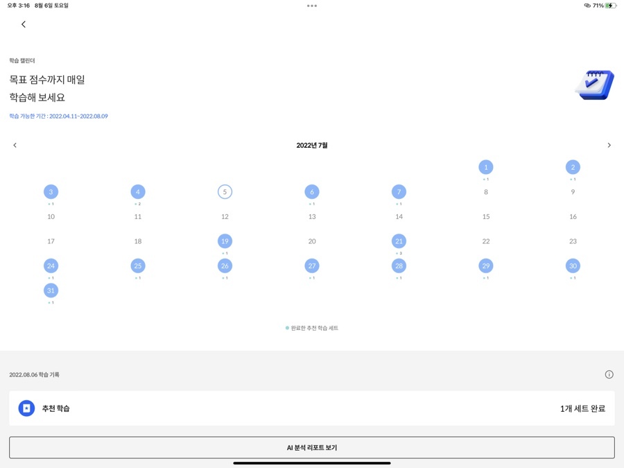 [추천 학습]은 한 번에 길어도 1시간 정도 소요가 되는 만큼의 양을 추천해줍니다. '추천 모의고사'는 15~20분이면 끝이 나지만, 여러 항목의 학습이 제공될 때는 40~50분이 걸린 적도 있어서요. 그래도 모두 1시간 안쪽으로 한 번의 학습 분량이 끝이 나니까, 하루에 한 개의 학습을 꾸준히 진행하기 좋았습니다. (네, 그래도 저는 두 달은 놀았어요. 공부 습관을 들이는 일은 쉽지 않으니까요.)