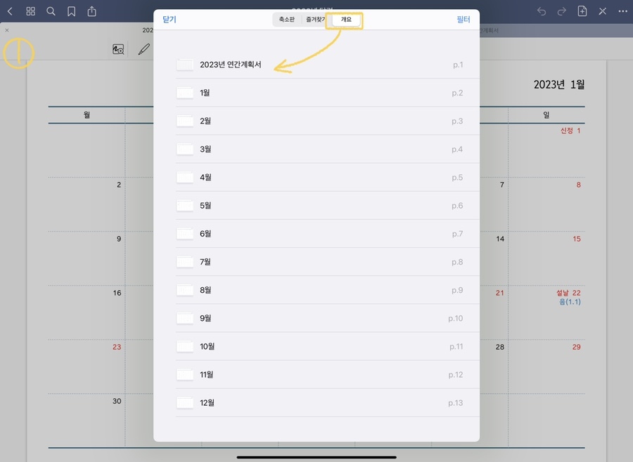 '연간계획서'는 '2023년 달력' 앞쪽에 붙여서 하나의 노트로 사용해도 좋고, 아니면 별도의 파일로 사용하셔도 좋아요. ①은 하나의 노트로 사용하는 방법이고 ②는 별도의 노트로 사용하는 방법이니, 필요에 따라서 자유롭게 사용하시면 될 것 같습니다. '연간계획서'도 목차를 설정해 둬서 '2023년 달력'에 추가해서 사용하시더라도 '개요'에 '2023년 연간계획서'가 들어가있는 모습을 확인해보실 수 있어요. 이미 목차로 설정을 해두었던 부분이라 자동으로 설정이 되는 듯 싶습니다.