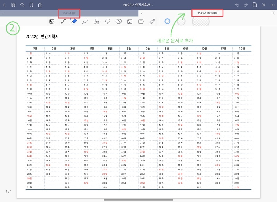 갤럭시 탭에서도 pdf 파일을 노트로 공유하여 사용이 가능한데요. 제가 갤럭시 탭은 거의 사용해본 적이 없어서 어떤 다양한 기능이 있는지는 잘 모릅니다. 그래서 가장 가본적인 부분만 가져와봤어요. 갤럭시 탭의 노트 어플은 가장 기본적인 '삼성 노트'와 'noteshelf'가 있는 듯 합니다. 해당 어플로 달력 파일을 받으니 아래와 같이 나오는 것을 볼 수 있었어요. 아쉽게도 '개요'라던지 '목차'는 찾지 못해서 제가 설정해둔 '목차' 기능은 활용할 수 없었지만, 파일은 잘 보였습니다.