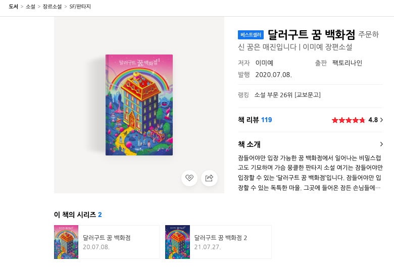 일상에 지쳤거나, 삶에 편안한 즐거움이 필요하다 하시는 분들이라면, [달러구트 꿈 백화점]을 찾아 보시는 것도 좋을 것 같아요.