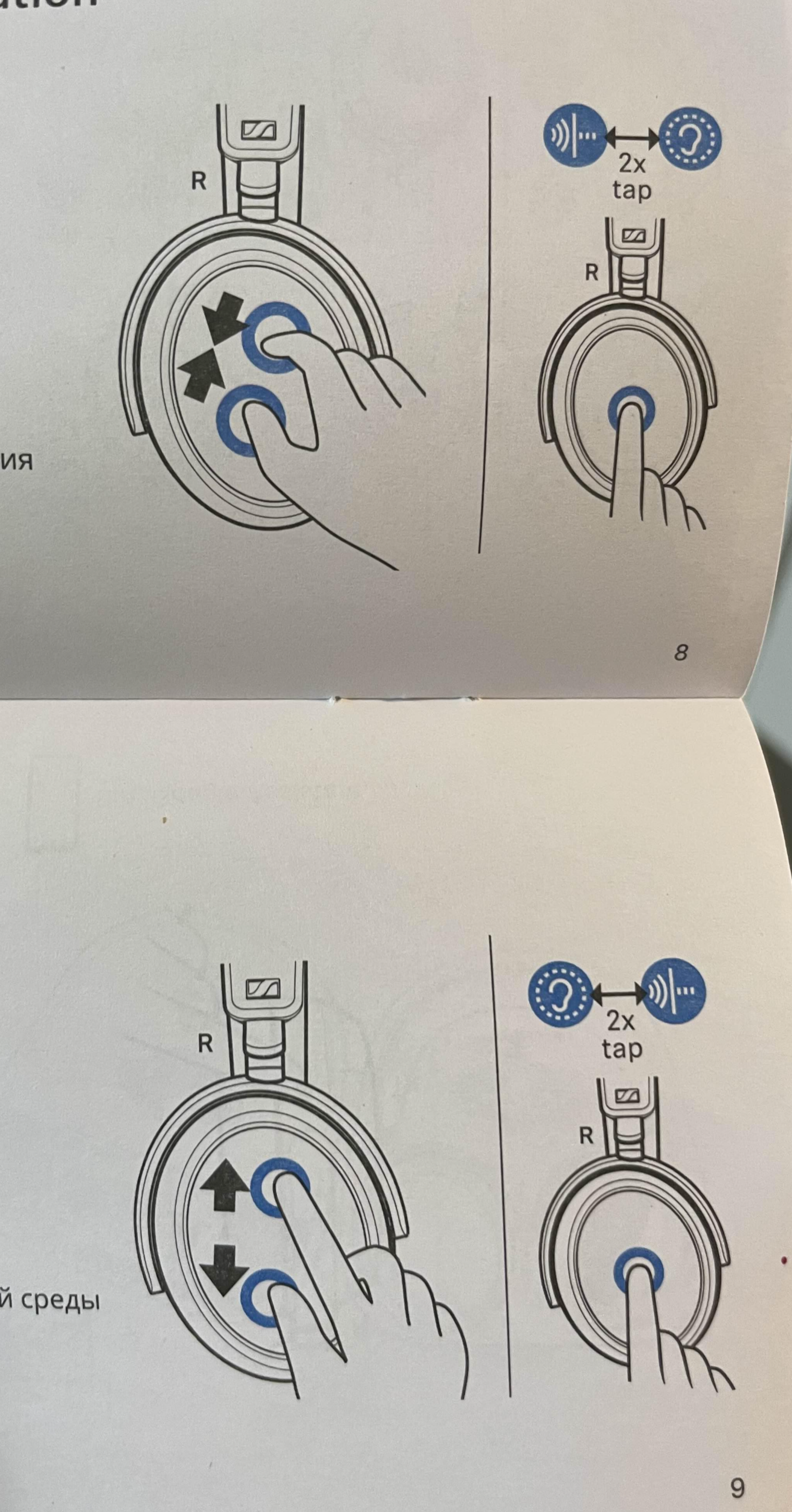 아래 사진 중 왼쪽 사진이 왼쪽 헤드폰의 모습이고, 오르쪽이 오른쪽 헤드폰의 모습입니다. 처음 샀을 때는 아래와 같이 간단한 사용법 필름이 붙어있어요. 거의 대부분의 작동은 오른쪽 헤드폰에서 진행이 되었습니다. 소리를 조절하거나, ANC를 조절하거나, 일시 정지 및 재생 그리고 전화 수신에 관한 것도요.