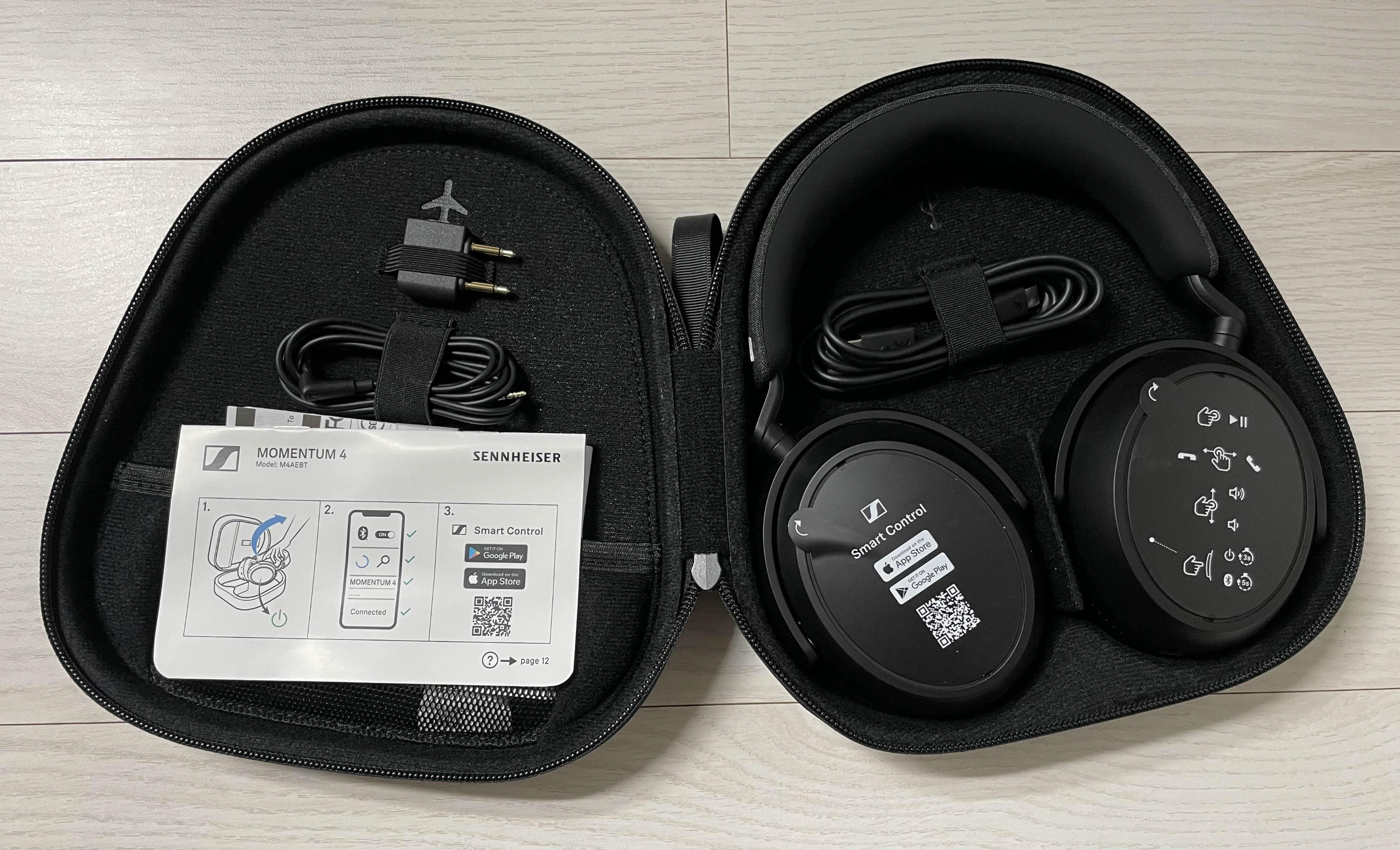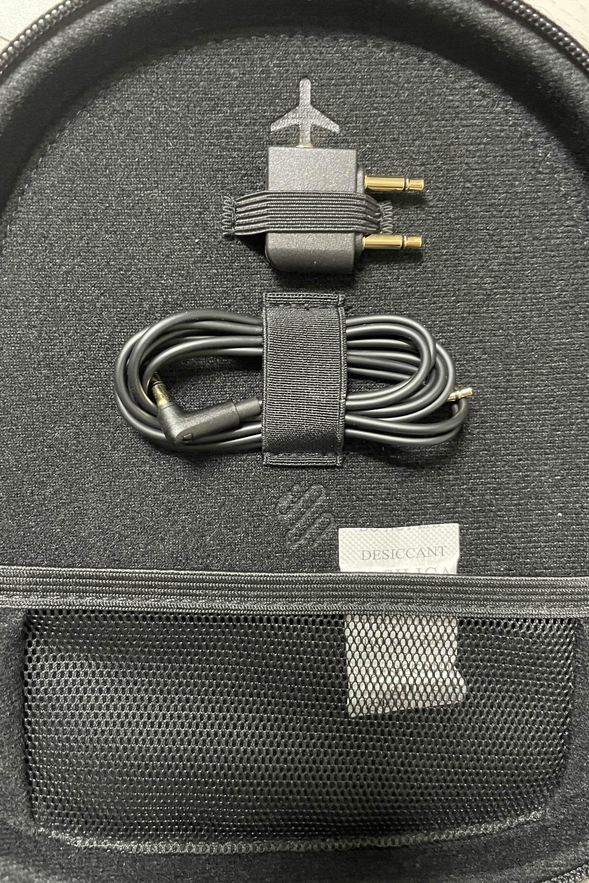 케이스를 열면 아래와 같이 구성이 되어 있습니다. 왼쪽에는 비행기용 연결 어댑터와 유선으로 들을 수 있도록 오디오 케이블이 각자의 자리에 맞게 끼워져 있었습니다. 그리고 그 아래에는 매쉬망이 있어서 간단한 물건을 보관할 수 있도록 되어 있었습니다. 그리고 오른쪽에는 헤드폰을 넣을 수 있는 공간과 헤드폰 충전 USB-C 케이블이 자리하고 있었습니다. 각자의 자리에 맞게 고무줄로 고정이 되어 있는 것도 깔끔해서 좋았습니다. 한 공간에 무지성으로 넣어지는 것이 아닌 각자의 자리가 정해져 있는 게 정말 마음에 들었어요.
