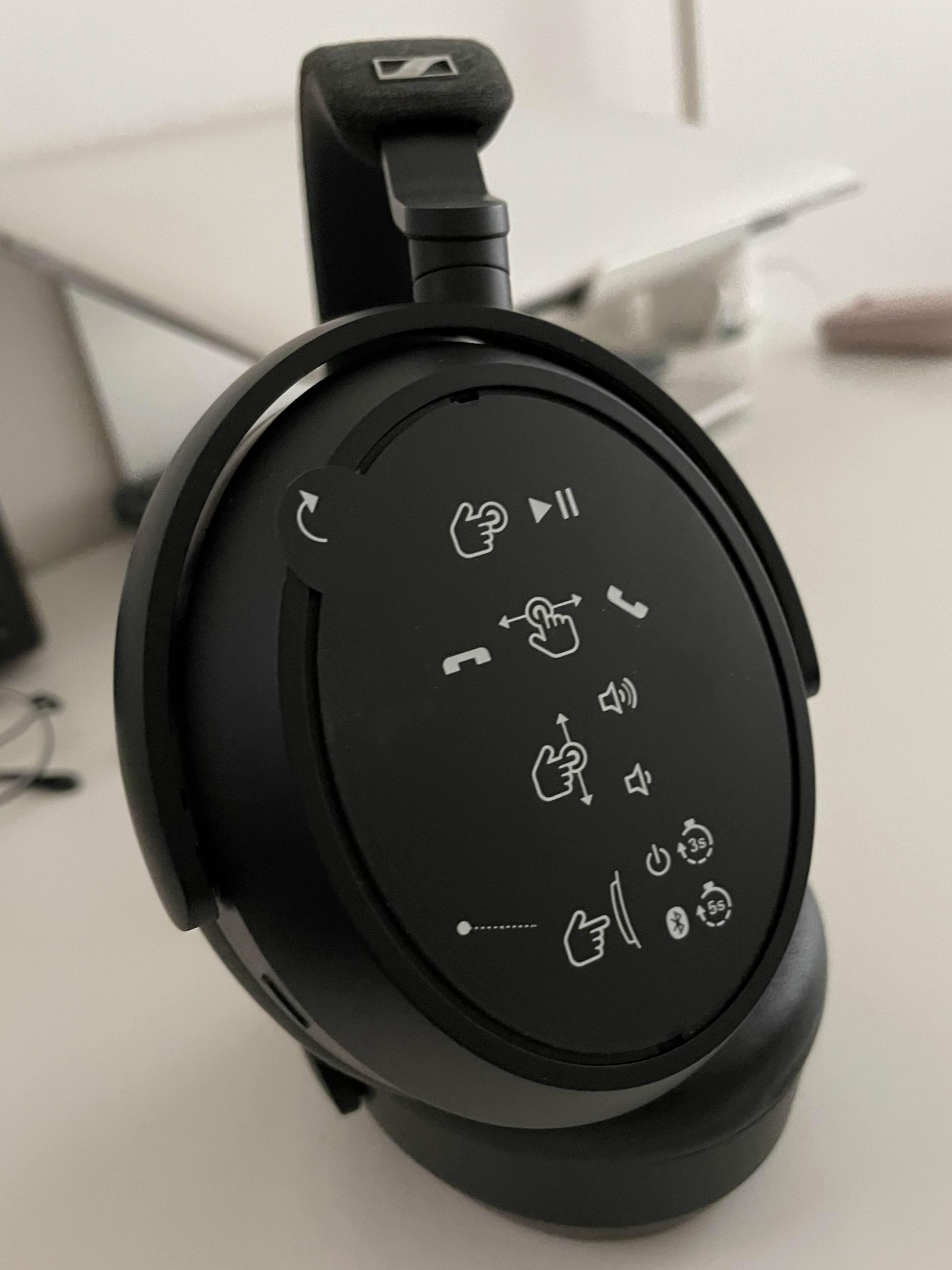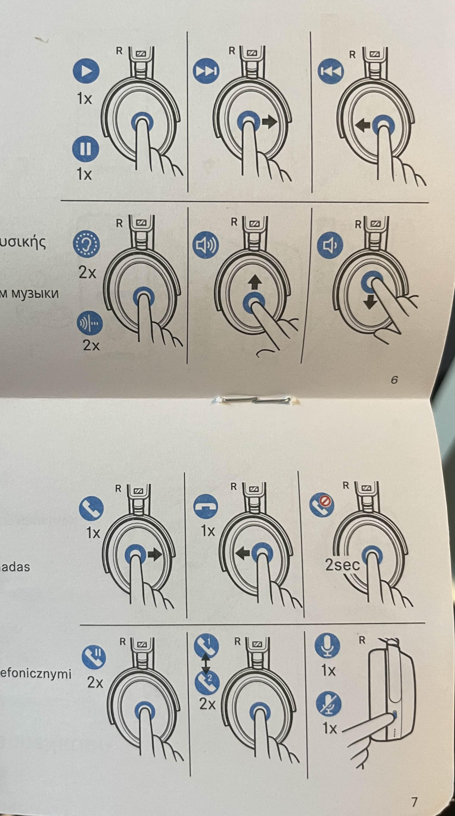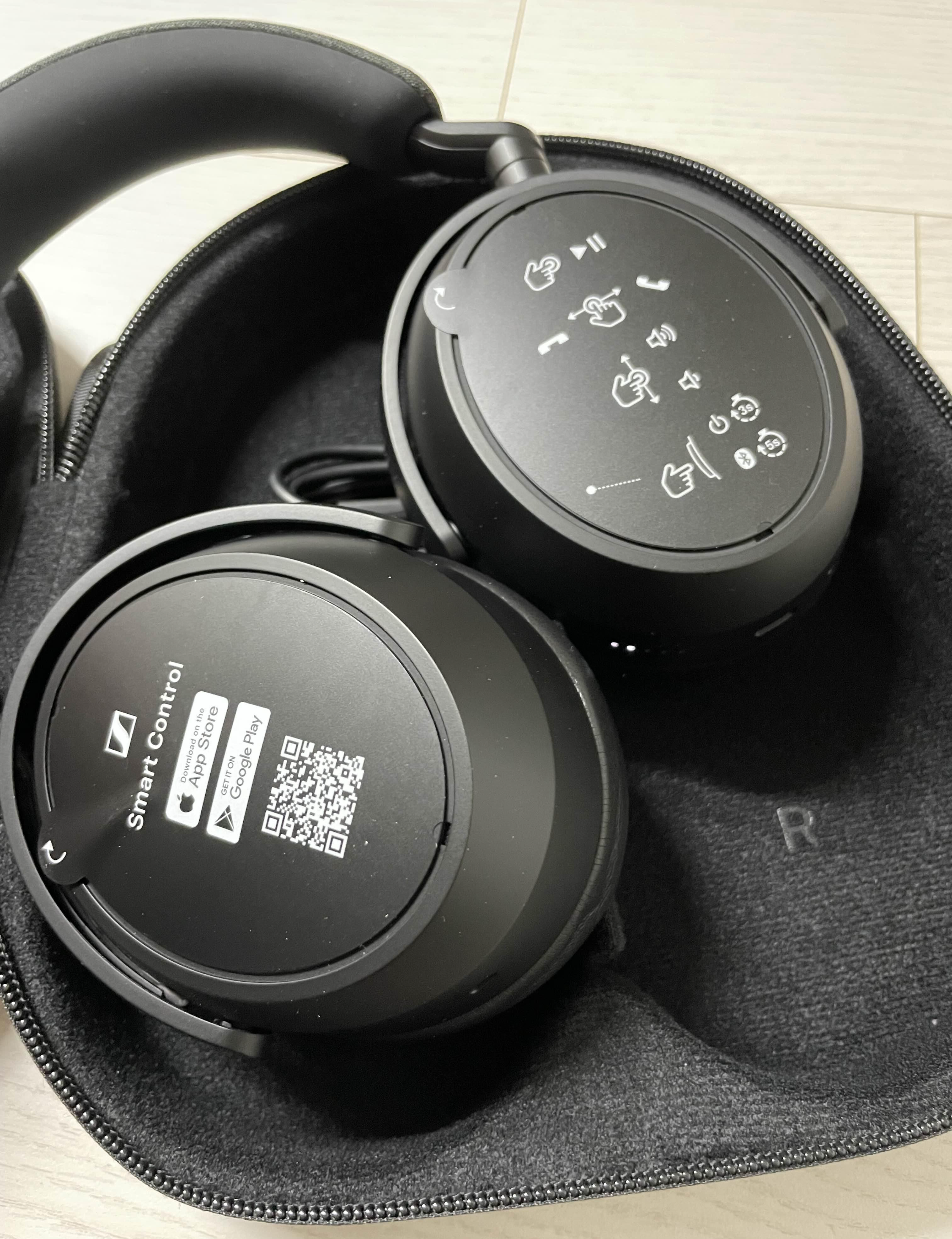 아래 사진 중 왼쪽 사진이 왼쪽 헤드폰의 모습이고, 오르쪽이 오른쪽 헤드폰의 모습입니다. 처음 샀을 때는 아래와 같이 간단한 사용법 필름이 붙어있어요. 거의 대부분의 작동은 오른쪽 헤드폰에서 진행이 되었습니다. 소리를 조절하거나, ANC를 조절하거나, 일시 정지 및 재생 그리고 전화 수신에 관한 것도요.
