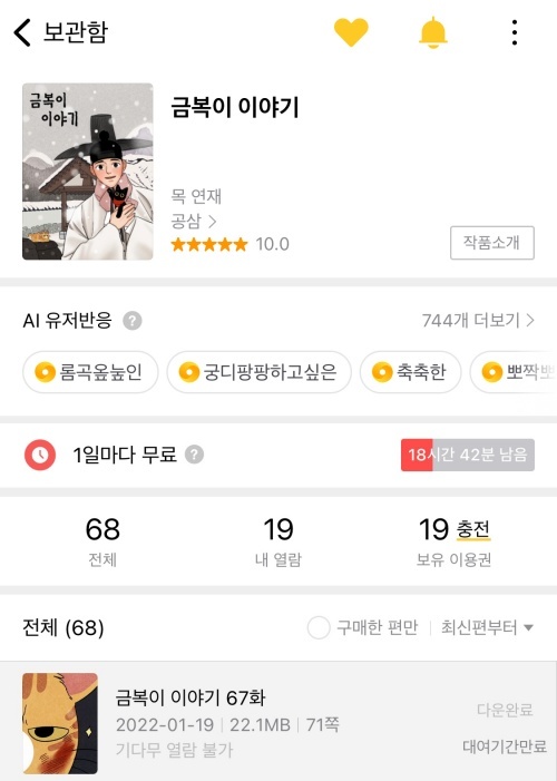 채 하루도 지나지 않아 67개의 이야기를 전부 대여 결제하여 읽고 말았고, 지난 3일(대여가 가능한 시간) 동안 저는 4번의 정주행을 마쳤습니다. (이럴 줄 알았으면 소장을 할 걸 그랬나 싶으면서도, 소장을 해버리면 나중에 단행본을 구매할 때 핑계가 사라진다는 이유로 스스로를 납득시키고 있습니다. ᵕ ᵕ̩̩ )