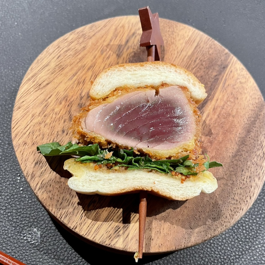 참치를 메인으로 한 미니 버거, 마구로 버거입니다. 디저트로만 끝이 나는 코스가 아쉬울 즈음에 이렇게 색다른 음식으로 기대를 충족시켜주었어요. 생참치를 가볍게 튀겨서 완전히 익히지 않은 채로 미니 버거를 만들어주었습니다. 사실 빵과 소스 그리고 상추는 특별할 게 없었는데요. 이 참치 튀김이 아주 맛이 좋았습니다. 참치 까스라고 해야 할까요? 속이 완전히 익지 않아서 가장 처음 먹었던 참치타다키같은 느낌이 들면서 부드럽고 고소하게 먹을 수 있었어요.