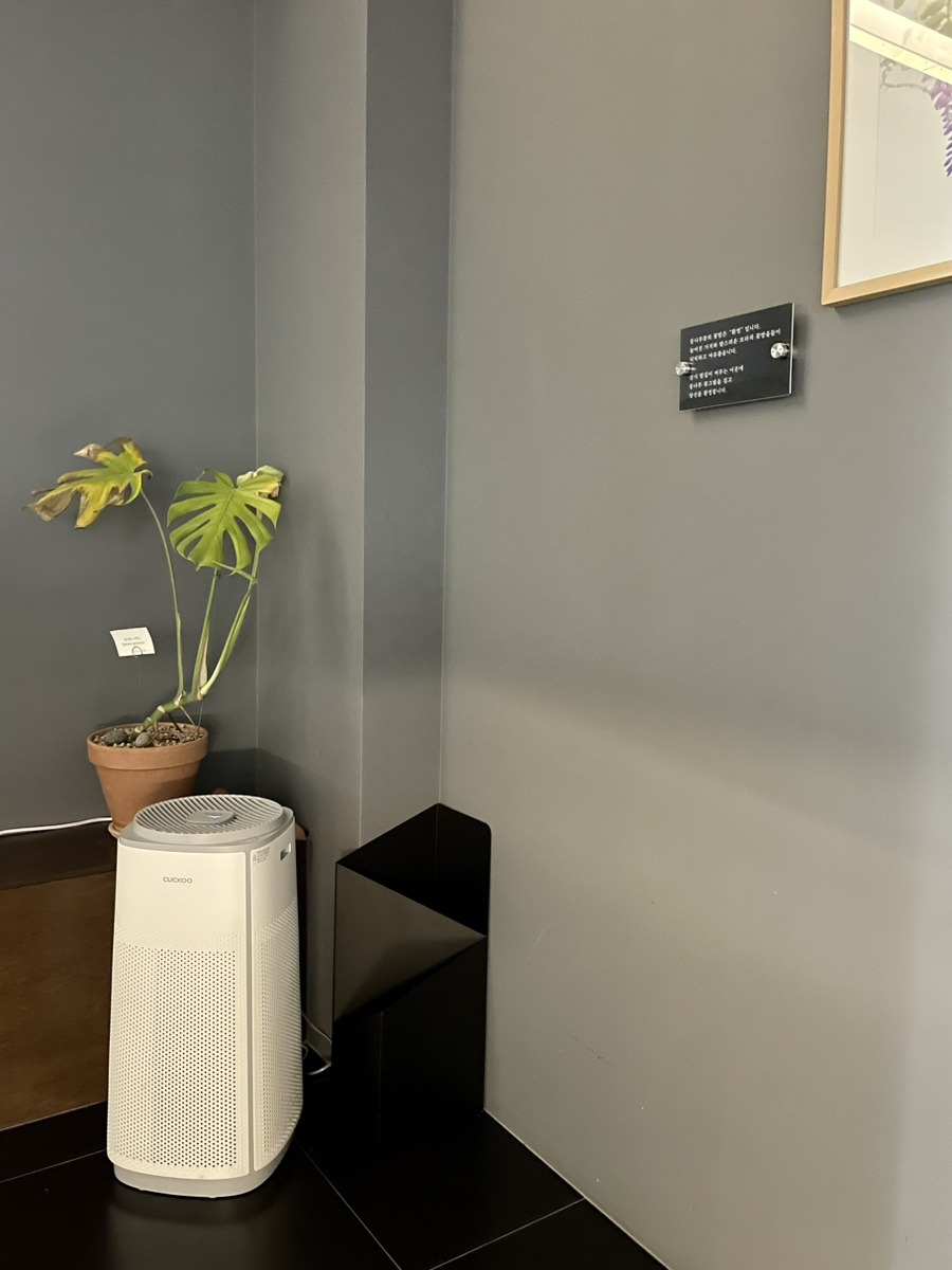 내부 분위기는 이렇습니다. 저희 가족이 가장 처음 도착을 해서 이렇게 사람이 없는 가게 내부 모습을 찍을 수 있었어요. 4인으로 예약을 해서 그런지 가장 안쪽의 코너 자리를 마련해주셨습니다. 자리 뒤쪽으로는 자그마한 화분이 놓여있었습니다. 그리고 바깥은 모두 까만 외벽과 문으로 이루어져 있어서 조금 답답할 수 있겠다는 생각을 할 수 있겠지만, 안에 들어오면 딱 포근한 분위기였습니다. 창문도 딱 알맞게 놓여있어서 답답함 없이 식당을 즐길 수 있었어요.