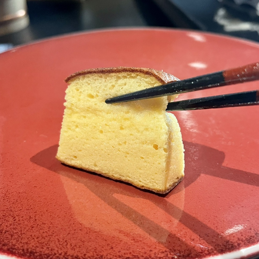 그리고 이제 코스가 끝나가는 느낌이 물씬 들었던 디저트, 교꾸입니다. 이건 밀가루나 이런 건 하나도 안 들어가고 오로지 계란만 들어갔다고 하는데 굉장히 쫀쫀하고 탱글탱글한 카스테라 같은 느낌이었어요. 편견처럼 가지고 있던 일본식 계란말이의 심각한 당도는 찾아볼 수 없을 만큼 담백하고 포근포근한 계란 구이였어요.