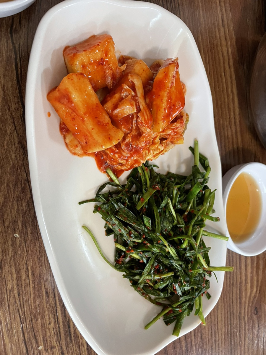식사가 나오는 속도도 정말 빨랐습니다. 아무래도 갈비탕이나 곰탕의 경우 미리 대량의 육수를 계속해서 끓이고 있기 때문에 가능한 속도이지 않았을까 생각했어요. 밑반찬은 김치가 전부입니다. 하지만 김치 이상이 필요가 없기도 했었어요. 국밥에는 김치면 되는 걸요. 개별로 제공되는 접시에 김치+깍두기와 부추 김치를 덜어서 먹을 수 있게 되어 있었습니다. 먹을만큼만 덜어서 먹을 수 있어서 좋았어요. 깍두기와 김치도 새콤하니 정말 맛이 있었지만, 부추 김치도 정말정말 맛이 있었습니다. 국밥과 잘 어울리는 부추 김치였어요.