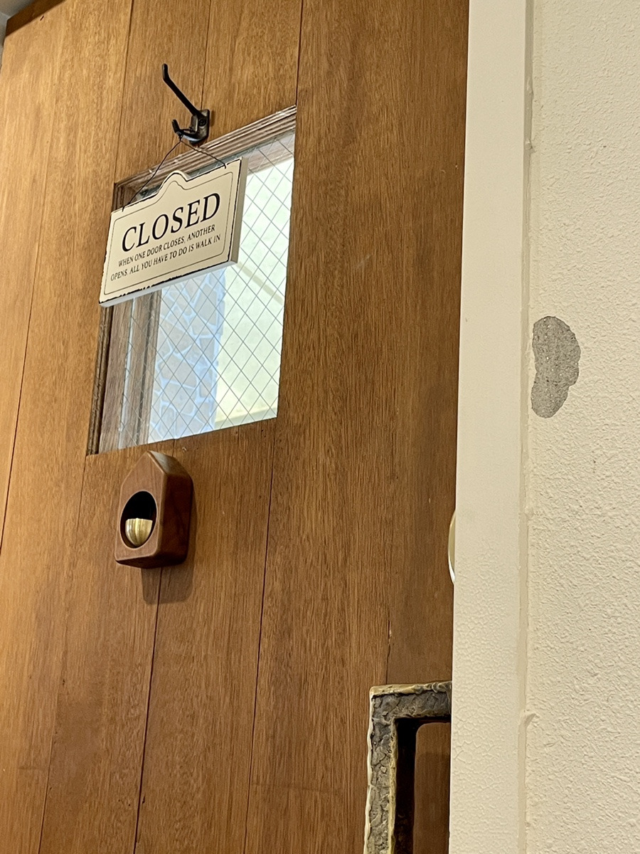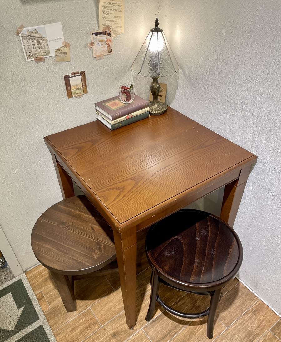 저는 출입문 옆에 자리를 잡았습니다. 자그마한 테이블에 의자까지 편하지는 않았지만, 분위기가 너무 좋았어요. 벽에 붙어있는 색색의 메모들과 귀여운 조명이 잘 어울렸어요. 그 자리에서 올려다 본 출입문도 뭔가 매력적이었습니다. 그래서 사진으로 남겨봤어요:)