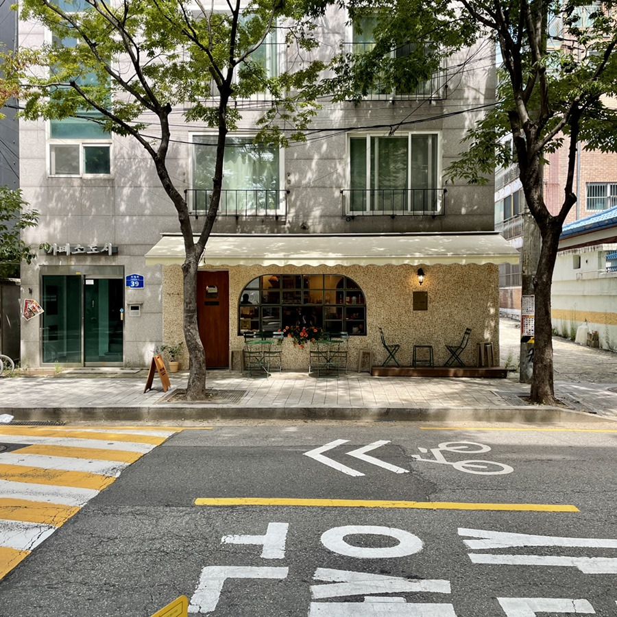 카페는 처음 마주했을 때, '앗, 여기가 유럽인가?' 싶었습니다. 노란 벽돌과 노란 차양, 그리고 아치형 창문과 거기에 걸린 작은 꽃들은 따스하면서도 이국적인 분위기를 보여줬어요. 빠른 걸음으로 슥 지나치다가도 다시 돌아와서 확인하게 되는, 그런 예쁜 카페였습니다.