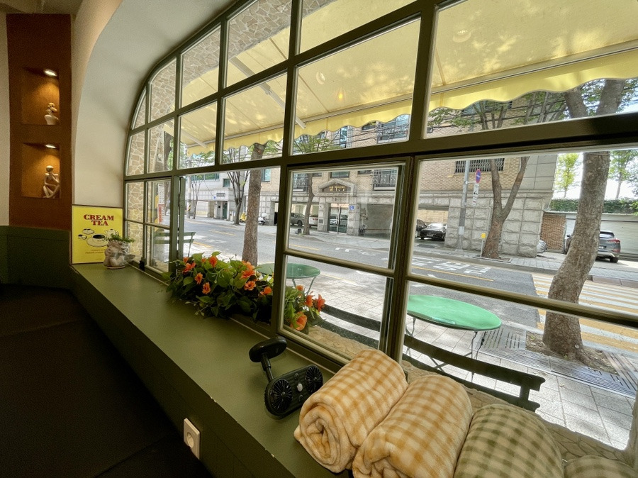 카페는 처음 마주했을 때, '앗, 여기가 유럽인가?' 싶었습니다. 노란 벽돌과 노란 차양, 그리고 아치형 창문과 거기에 걸린 작은 꽃들은 따스하면서도 이국적인 분위기를 보여줬어요. 빠른 걸음으로 슥 지나치다가도 다시 돌아와서 확인하게 되는, 그런 예쁜 카페였습니다.