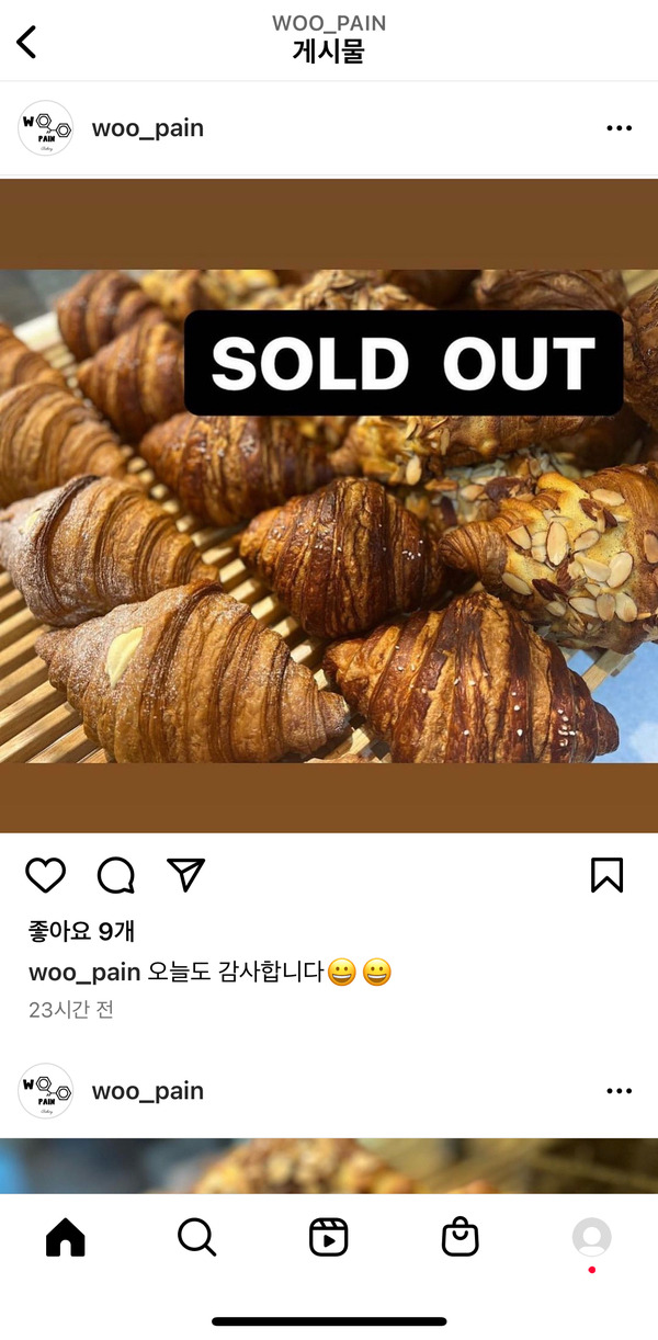 보통 빵이 마감시간까지 남아계신 적이 거의 없는 것 같았습니다. 한번은 제가 3시 40분쯤 방문을 했었는데, 남아 있는 빵이 거의 없었거든요. [sold out]이 적힌 게시물도 보통 5시 이전에는 항상 올라왔던 것 같습니다.