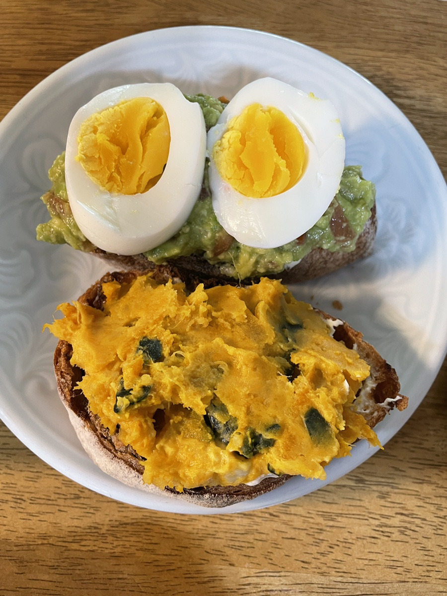 두 종류의 깜빠뉴가 있는 집인데, 그 중에 무화가 깜빠뉴입니다. 무화과와 크렌베리가 정말 한 가득 들어있는 깜빠뉴예요. 빵도 고소해서 아무것도 바르지 않고 먹어도 충분히 맛이 있었답니다! 저는 크림치즈를 발라 먹거나 오른쪽의 사진과 같이 요리(?)를 얹어 먹었어요. 엄마가 특별히 만들어주신 과카몰리와 단호박 범벅입니다:) 빵이 조금 딱딱해서 촉촉한 것들과 같이 먹으니까 더 맛이 있더라고요.